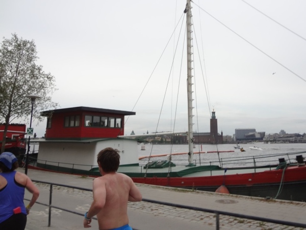 Vom anderen Ufer grüsst Stockholms mächtiges Rathaus und Wahrzeichen, das Stadshuset. Auf der Spitze des 106 Meter hohen, wuchtigen Turms glänzen drei Kronen, das schwedische Wappensymbol. Schräge Wohnboote und schwimmende Restaurants liegen diesseits des Ufers vor Anker. Über uns thront die ehemalige Münchenbrauerei. Die Luft ist immer noch schwülheiss. Ich frage mich, wie ich diesen Marathon durchstehen soll. Doch nun fallen erste kühlende Regentropfen.