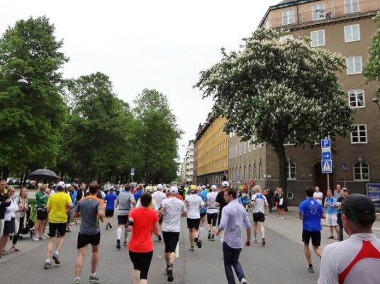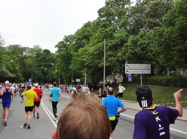 Unsere Füsse tragen uns locker der Halbmarathon-Marke entgegen. Ein blauer Teppich mit der Aufschrift Stockholm Marathon 2013 bietet den Hintergrund für die Erinnerungs-Fotos, die man von hoher Warte aus von uns schiesst. 1:56:36 Stunden sind wir unterwegs. Andreas fühlt sich prächtig, und bei mir läuft es auch ganz gut. Jetzt geht es schon heimwärts!