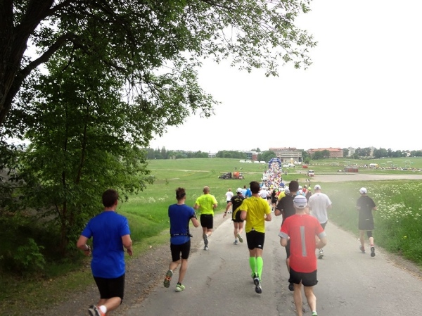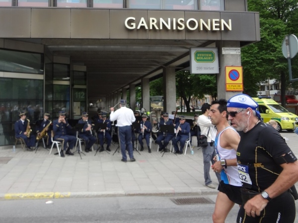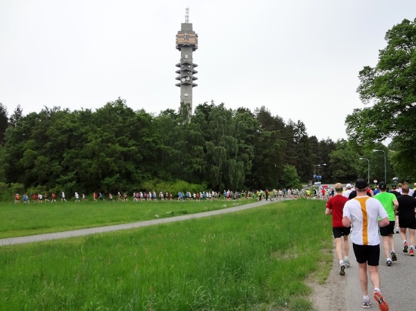 Km 21 bis zum Halbmarathon - Wir streben dem bunten Läufertatzelwurm entgegen, welcher vor dem Fernsehturm Kaknästornet zur Überquerung von Gärdet ansetzt. Ein einziger asphaltierter Weg führt diagonal über die Grasfläche. In der Mitte hat er einen Buckel, bei windigem Wetter ist man vollkommen den Naturkräften ausgesetzt. Die Stadt ist in weite Ferne gerückt. Es beginnt stärker zu regnen. Doch auch hier draussen stehen Marathon-Fans. Würden sie fehlen, wären wir nicht einsam. Pferde grasen direkt an der Strecke. Der Buckel ist überwunden, der Halbmarathon-Bogen kommt in Sicht, während wir an der Festung Borgen vorbei laufen. Hier residierte der König im 19. Jahrhundert um seinen Truppen bei den Manövern zuzuschauen.