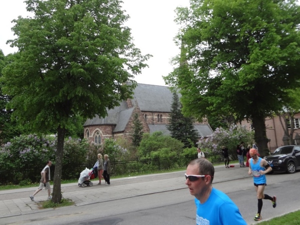 Km 19 - Vorbei wünschen wollen wir uns die vor uns liegenden Kilometer keinesfalls. Es gibt so unglaublich viel zu erleben. Angetrieben vom Konzert im LKW traben wir erneut den Hügel zum Radio- und TV-Huset hinan. Beim Bürogebäude Garnisonen spielt die Blasmusik unermüdlich. Dann folgt Neuland, die 10-Kilometer-Schlaufe durch Stockholms grüne Lunge. Bevor das grosse Grün beginnt, kommen wir zur Englischen Kirche. Das aus rotem Sandstein erbaute Gotteshaus wurde 1913 Stein für Stein abgebaut und von Norrmalm hierhin versetzt.