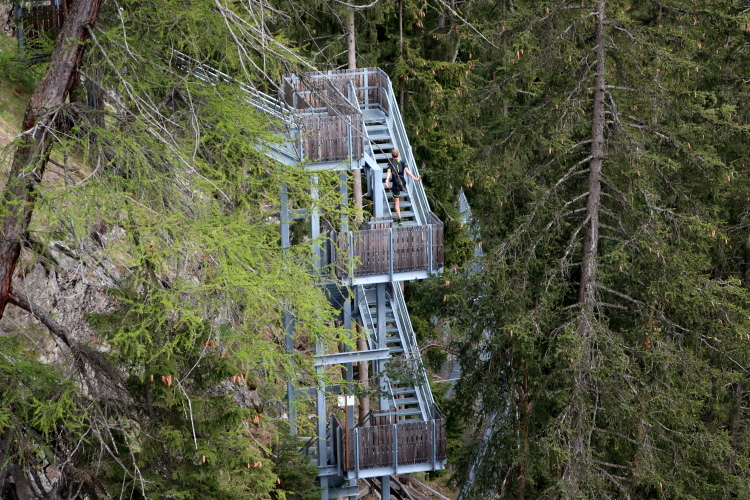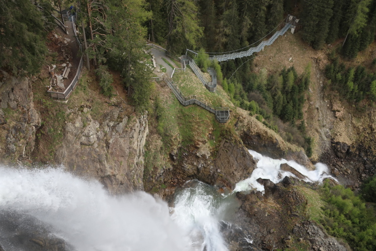 Je höher wir kommen, desto mehr trennen uns Fels und Natur vom Wasser, auch wenn das Tosen uns weiter begleitet. Auf einmal sind wir oben, an der Kante des Tauferbergs. Über eine kleine Hängebrücke überqueren wir den Bach, der sich hier nur noch als ganz normaler munterer Gebirgsbach präsentiert, während er wenige Meter weiter so spektakulär mit voller Wucht und Kraft in die Tiefe donnert. Ich bin noch ganz euphorisiert und wäre für dieses Erlebnis gerne auch noch ein paar Hundert Stufen weiter gestiegen, aber jetzt muss ich wieder mit alpiner „Normalkost“ vorlieb nehmen.
