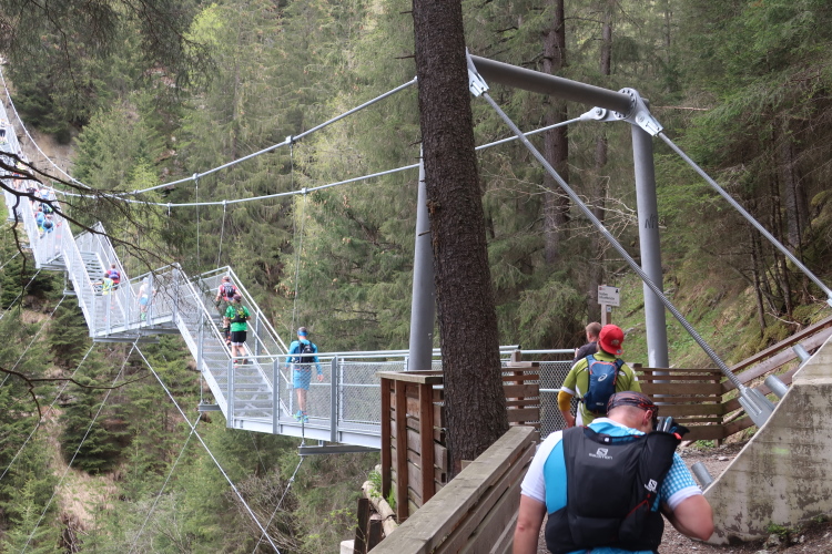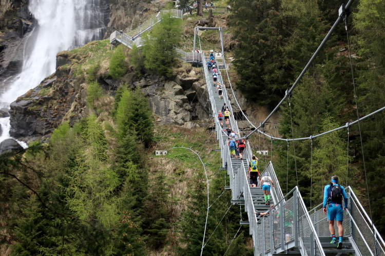 Und dann stehen wir auf einmal an ihrem Zugang. Ehrfürchtig blicke ich nach oben, auf die sich am Horizont im langen Anstieg verlierenden bunten Punkte der Läufer und das daneben gen Tal tosende Wasser. Was für eine Kulisse! Hochmotiviert wage auch ich mich auf diese Brücke zwischen Himmel und Erde und muss sogleich feststellen, dass mir ganz komisch wird. Als wäre ich besoffen oder auf hoher See: Die Hängebrücke schwankt unter den Läuferbeinen in einer Weise auf und ab, dass man fast seekrank werden könnte. Nicht nur ich halte mich an der „Reling“ ein und versuche in schnellem Schritt wieder festen Boden unter die Füße zu bekommen. Andererseits: Ich bin begeistert – das ist absolut einmalig. Die harte Steigarbeit setzt sich danach fort. Eine Kehre reiht sich an die andere. Durch den Gitterrost des Bodens haben wir stets freie Sicht in alle Himmelsrichtungen.