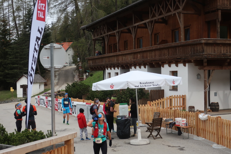 Auf einem breiten Forstweg geht es durch den Wald flott weiter. Schmale Pfade sorgen zwischendurch für etwas Würze, Abwechslung und auch reduziertes Tempo im Abgalopp. Näher und näher rückt der Zielort und irgendwie erstaunt bin ich, als nach 20,7 km, schon ganz nahe an den Häusern von Umhausen, nochmals eine Streckenverpflegung aufgebaut ist.