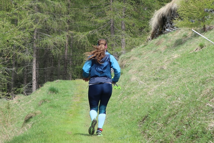 Entspanntes Laufen steht nun auf dem Streckenprogramm. Durch saftig grüne Wiesen führt der Kurs, mit weitem Blick hinein ins Horlachtal und die noch schneebedeckten Berge rundum. Niederthai liegt vor uns, ein Ortsteil von Umhausen, aber eben 500 Meter höher als der Hauptort. Auf viele verstreute kleine Weiler verteilen sich die gerade einmal 300 Einwohner. Ein spezieller läuferischer Gimmick erwartet uns hier. Denn es gilt ein Stück Wiese der Kategorie „supersteil“ zu bewältigen. Zwei Seile mit Halteschleifen sind ausgelegt, sodass man mit Armkraft den Vortrieb nach oben unterstützen kann. Bei den Läufern kommt das gut an, jedenfalls sieht man mehr lachende als gestresste Gesichter.