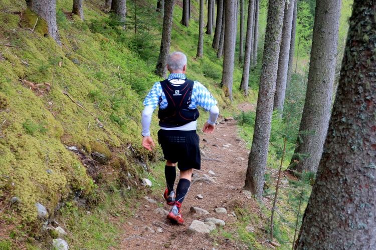 Ein Stück weit folgen wir noch dem Sträßlein, das sich alsbald auf Naturboden fortsetzt, bis uns ein plötzlicher Abzweig auf einen schmalen Pfad lotst. Fels, Wurzeln, Matsch, ja selbst ein seilgesicherter Knüppelsteig bestimmen den Charakter des ausgesetzten Single Trails durch den Bergwald, der sich Kurve um Kurve in die Höhe schraubt, ohne dass ein Ende absehbar wäre. Wohl dem, der hier Laufstöcke dabei hat. Ich nicht, sodass ich mich mühselig Schritt für Schritt nach oben schleppe.