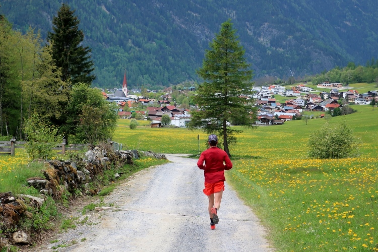 Vorbei an blühenden Obstbäumen und durch die Wiesen geht es gen Süden, zunächst noch auf Asphalt, hinaus aus dem beschaulichen Ort. Auch wenn das Tempo flott ist, so ist die stetige leichte Steigung taleinwärts deutlich zu merken. Hinter dem Kneipphäusl tauchen wir nach links ab in den Wald. Ein kurzer knackiger Anstieg stellt uns erstmals konditionell auf die Probe, dann ist Entspannung entlang des Waalwegs angesagt. Ein künstlich angelegter Bewässerungskanal bestimmt den Verlauf des schmalen, flach durch den Wald führenden Höhenwegs. Wenig später ändert sich die Szenerie: Auf einem breiten Naturweg folgen wir nun dem rauschenden Horlachbach, jenem Gebirgsbach, der, aus den Resten des Zwieselbachferners in den Stubaier Alpen entspringend, als Stuibenfall zwischendurch so spektakulär in die Tiefe stürzt.