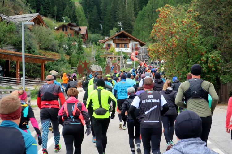 Um Punkt zehn Uhr hat das Warten ein Ende und der Läuferpulk ergießt sich erwartungsfroh über die Startlinie. Wie auf der Originalstrecke führt der Kurs einmal um das Gelände des Sexten Hauses herum und dann entlang der Durchgangsstraße erst einmal flach weiter ins benachbarte Moos. Jenseits der Talwiesen haben wir beim gemütlichen Trab die Dolomitengipfel stets im Blick.
