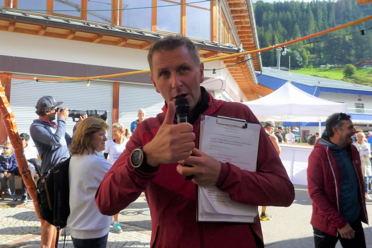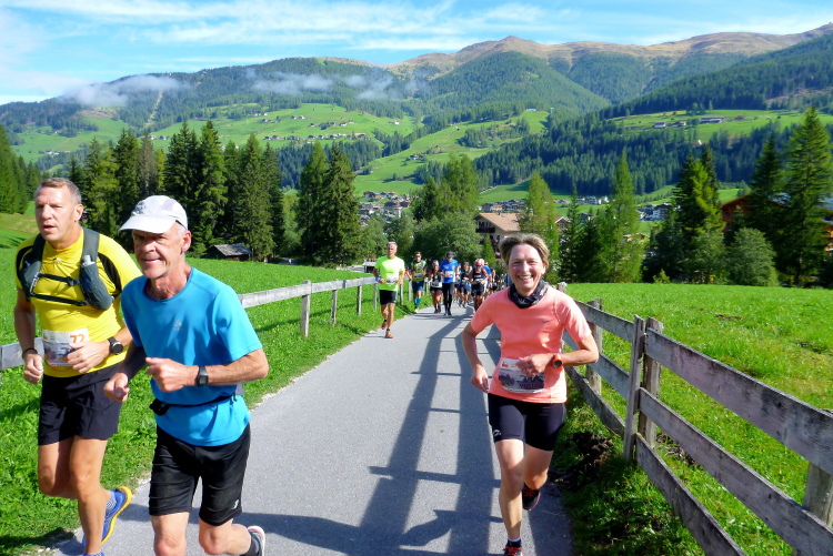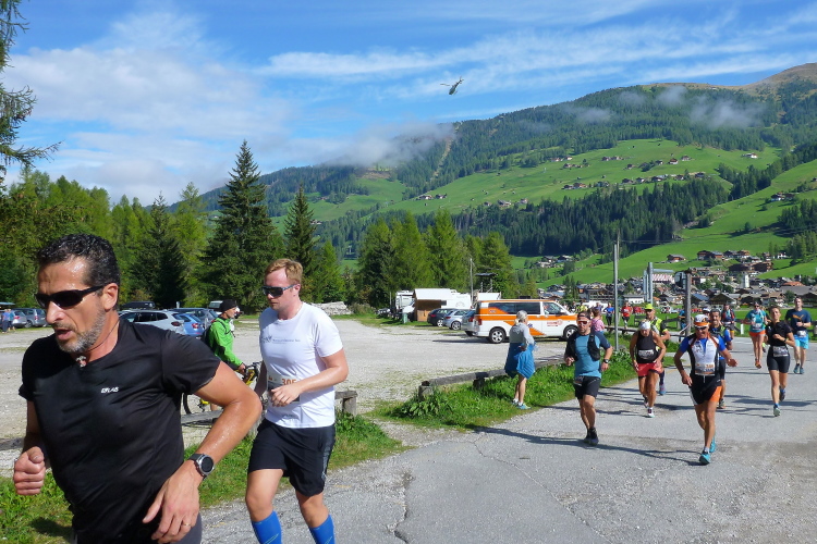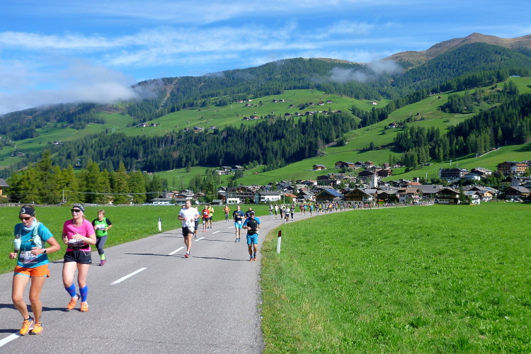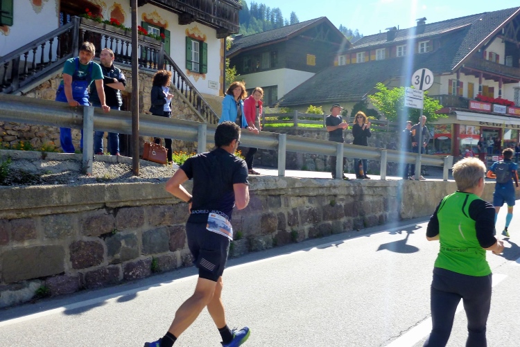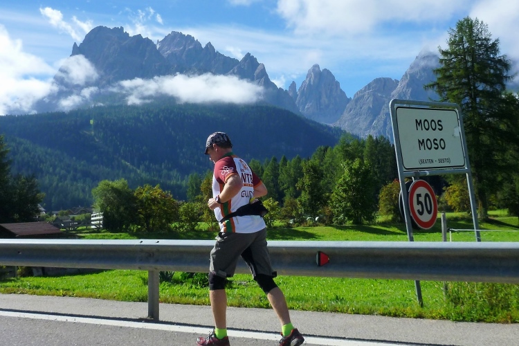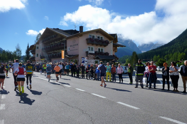 Bei strahlendem Sonnenschein geht es pünktlich um zehn Uhr los. Man schickt uns zunächst einmal in die falsche Richtung auf eine Dorfrunde, damit auch alle Fans ausreichend Gelegenheit haben, uns gebührend zu bewundern und Beifall zu zollen. Ich halte mich, wie es sich für mich geziemt, unauffällig im hinteren Bereich auf. Die paar Höhenmeter im Ort überzeugen den einen oder anderen schon zu flottem Gehschritt, dem ich noch entsage. Nach wenigen Minuten sind wir wieder zum Haus Sexten zurückgekehrt und verlassen bald darauf den Startort auf der breiten Landstraße. Rechts und links beeindrucken bereits graue Dolomitenzacken, die ich so sehr schätze. Günther, unser Tiroler, der sich nach seinem Achillessehnenanriss von vor sechs Wochen erst auf den letzten Drücker dann doch für den Start entschieden hat, überholt, und wird am Ende natürlich weit vor mir oben eintreffen.