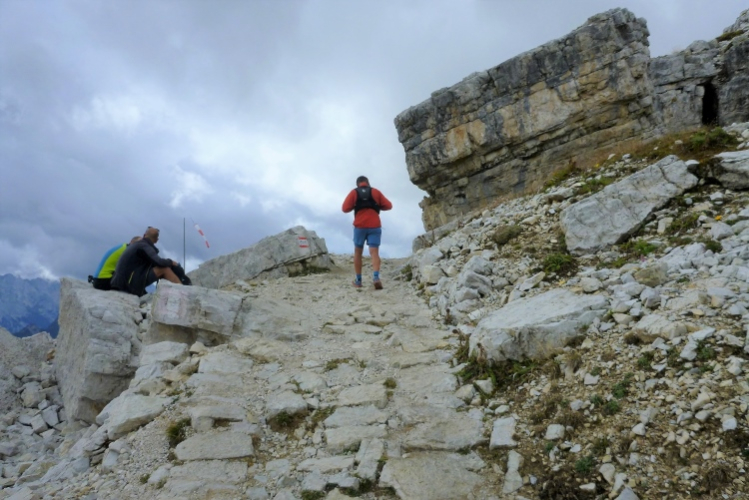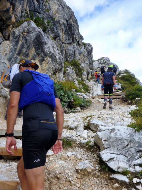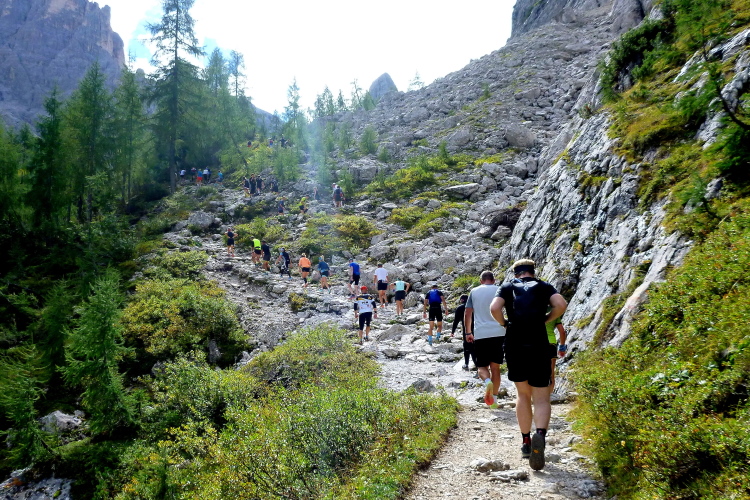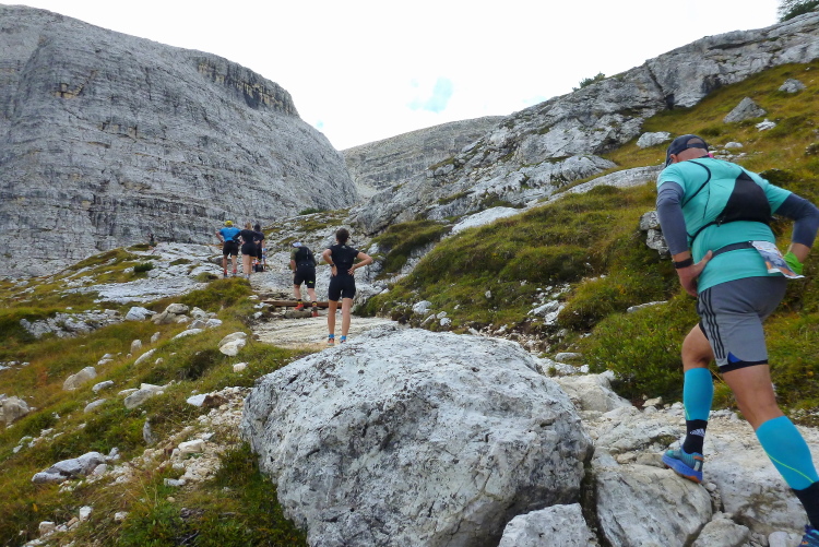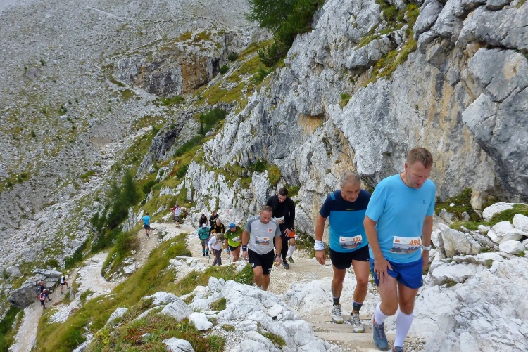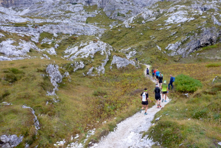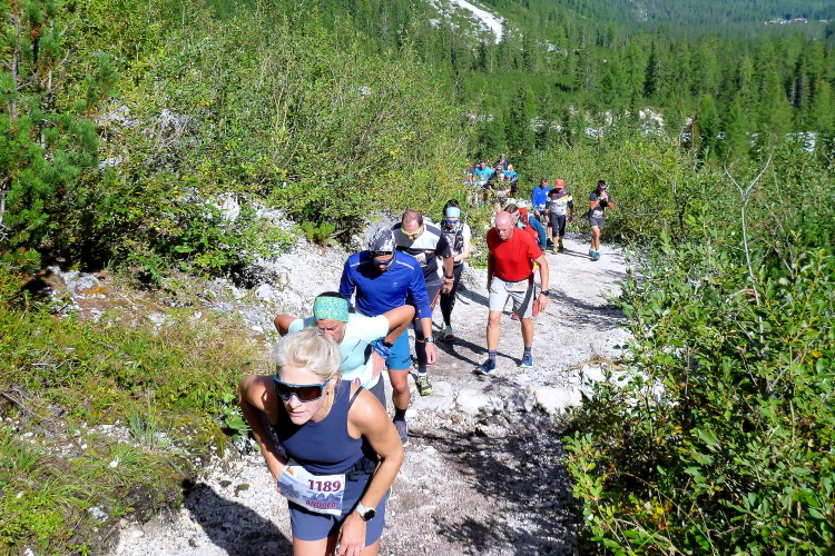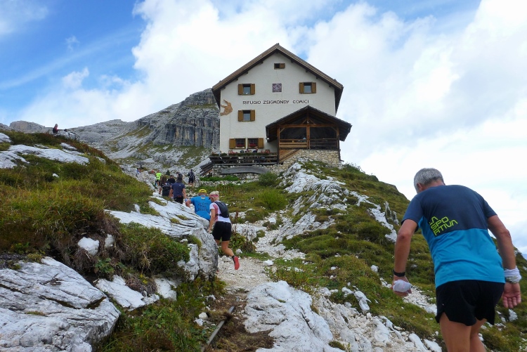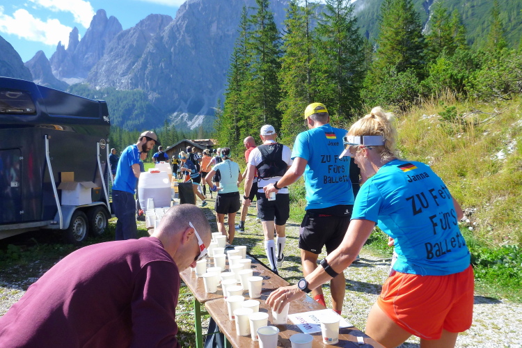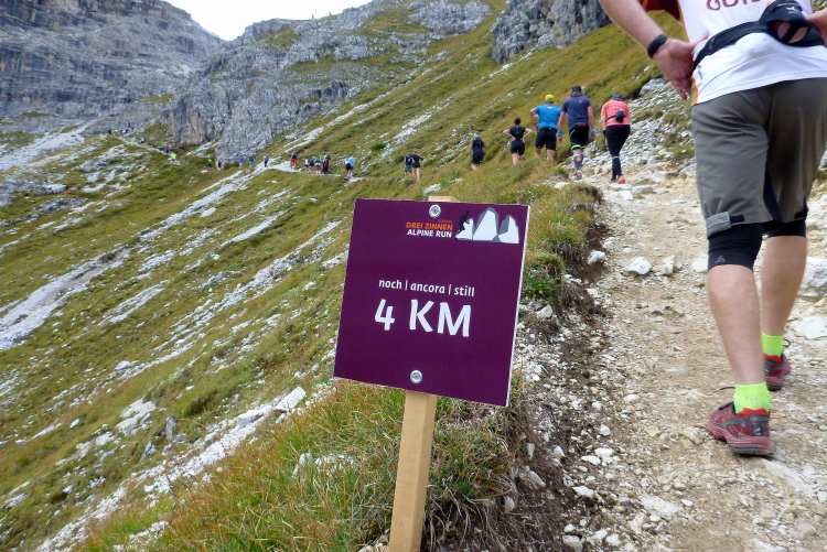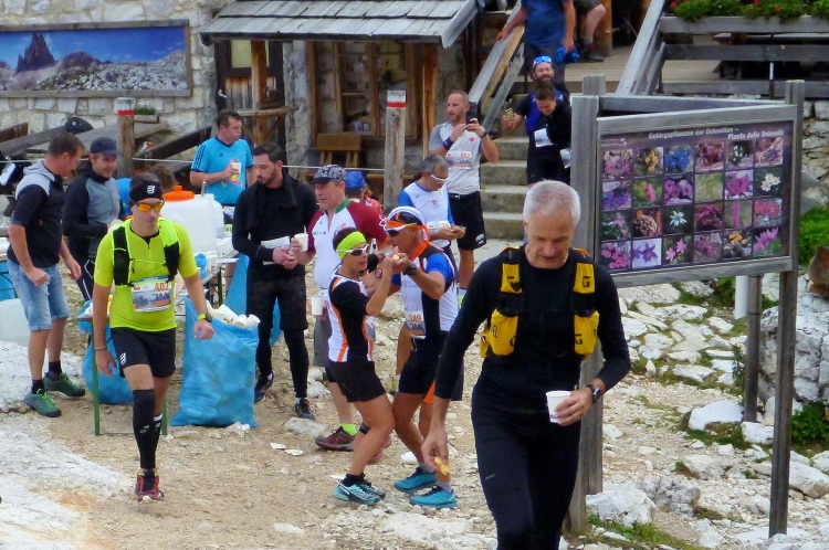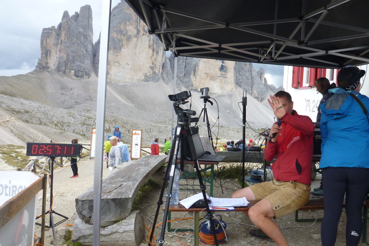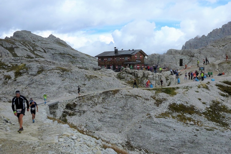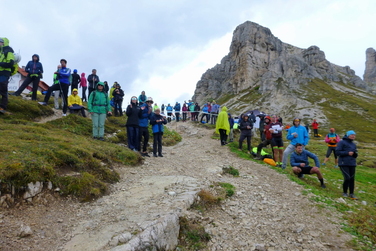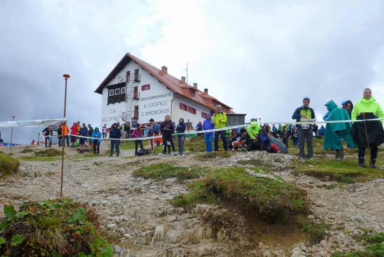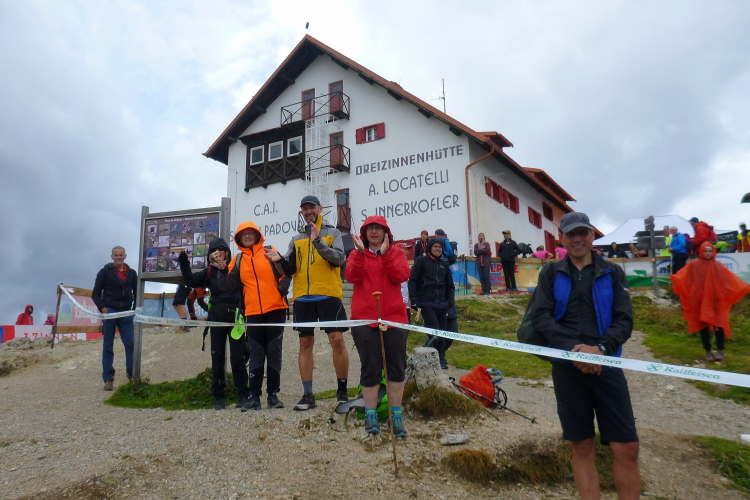 Ah, Hallelujah, am nächsten Grat sehe ich ein Gebäude aufblitzen und höre die Zielmoderation. Viele Menschen blicken auf uns herab und hoffen, in der bunten Schlange ihre(n) Liebsten zu entdecken. Mei Oide is a do, und gemeinsam mit Bärbel und Günther trägt mich ihr Applaus auf 2.405 m Höhe ins Ziel, im Hintergrund die unvergleichlichen Drei Zinnen. Natürlich erst, nachdem ich mich bei der Gattin „mündlich“ bedankt habe.