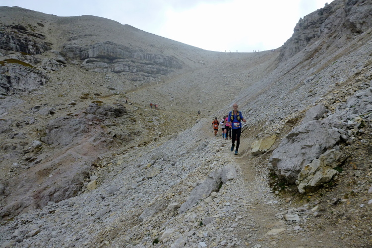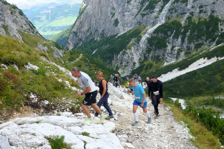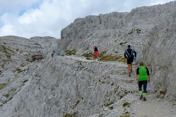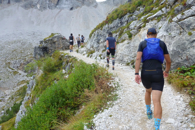 Richtig kalt ist es inzwischen geworden und genauso richtig geil ist der Blick voraus auf den dünnen Fußweg durch die Schuttkare. Letzter km! Von wegen bergab! Immer wieder verfalle ich in einen schleppenden Schritt. Die Erkältung, die ich mir wohl in Irland eingefangen habe, und der zum Trotz ich doch gestartet bin, raubt wohl schon einiges an Kraft (mein Start wird aber ohne gesundheitliche Nachteile bleiben).