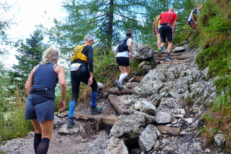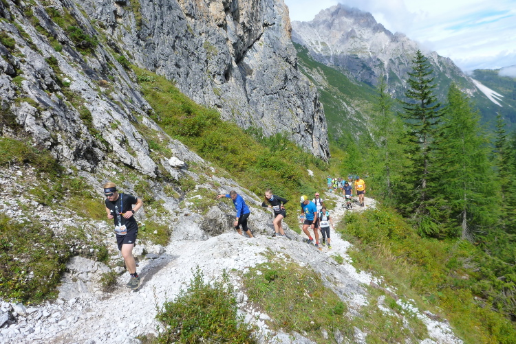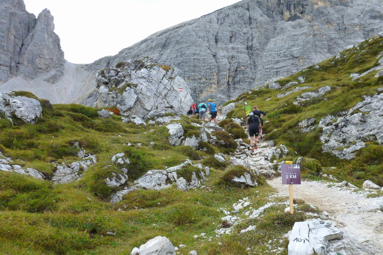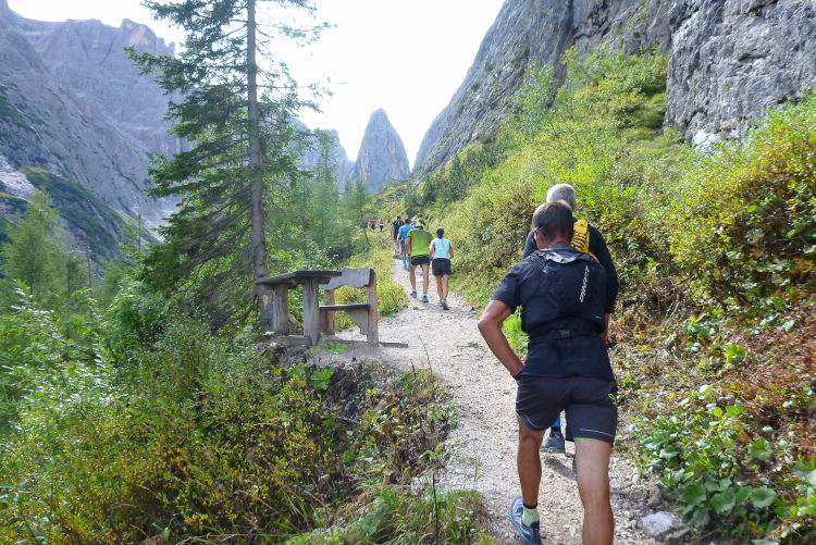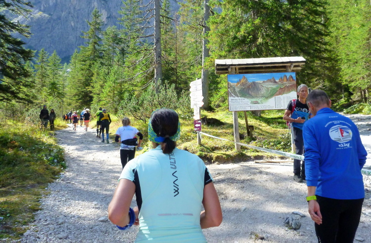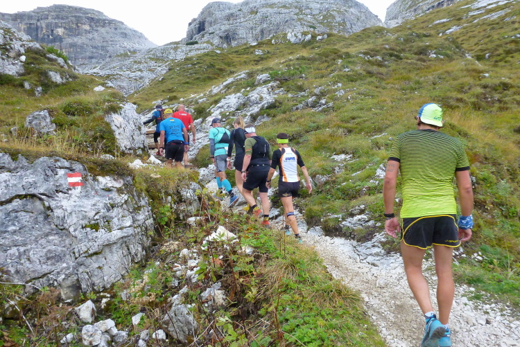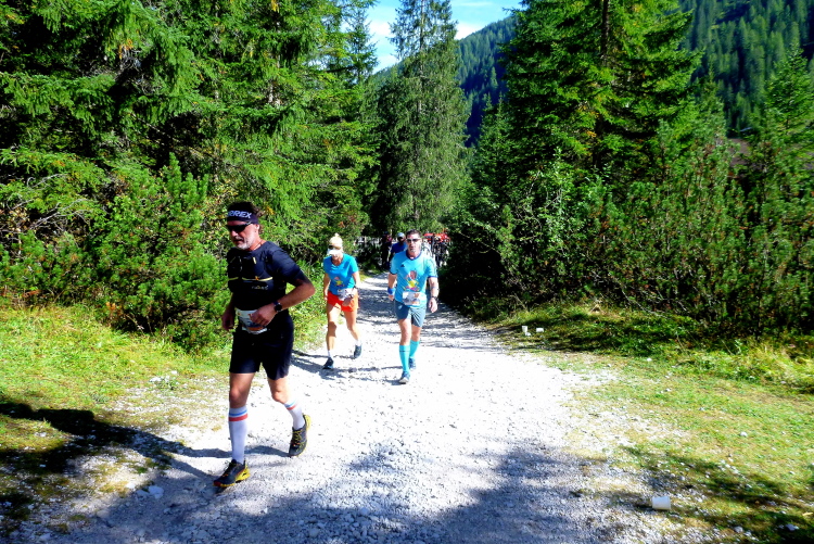3:40 Std. Wanderzeit zur Dreizinnenhütte zeigt der Wegweiser an, als wir von der Landstraße auf den geschotterten Wanderweg abbiegen. So viel Zeit werde ich hoffentlich nicht brauchen, auch wenn mir klar ist, dass heute lange Gehpassagen dabei sein werden. Ich treffe Monika und Frank, unsere Serientäter hier vor Ort. Moni hat extra ihren Urlaub verlegt, als sie unsere Lauftreffaktion mitbekam, so sehr schätzt sie gleichermaßen Kurs und Gegend. Eingerahmt von sattgrünen Wiesen und durch lichten Lärchenwald steigt der Weg langsam an, Laufen ist problemlos möglich. Schon sind die ersten fünf km gepackt, ich fühle noch keinerlei Anstrengung. Der Untergrund wird gröber, später als angekündigt erscheint der erste VP an der Fischleinbodenhütte (1.454 m, gestartet waren wir auf 1.320 m) mit Flüssigem. Locker-flockig geht es weiter, der Pressemensch auf dem Quad verfolgt lange die Kollegin von der Fraktion „Zu fett fürs Ballett“, ihr blonder, wippender Pferdeschwanz hat es ihm ganz offensichtlich besonders angetan.
