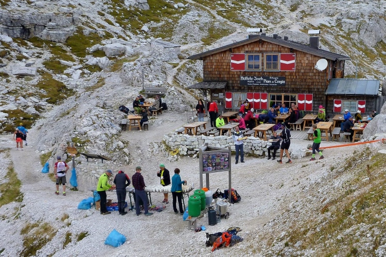 Von hinten werde ich erkannt, Steffen Rothe gibt sich zu erkennen. Viele Etappen haben wir gemeinsam vor Jahren auf dem Rheinsteig-Erlebnislauf, Gott habe ihn selig, absolviert. Schön ist das Wiedersehen nach etlichen Jahren, doch knapp der Atem, zumindest meiner. Hoch über uns erscheint mit der Zsigmondy-Hütte auf 2.224 m am Fuße des Zwölferkogels erfreulicherweise ein weiterer markanter Wegpunkt. Die Hütte wurde nach dem Wiener Alpinisten Emil Zsigmondy benannt, in brauner Zeit trug sie auch schon mal den Namen des „Duce“. Uns beglückt sie nicht nur mit dem vollen Verpflegungsprogramm, sondern auch mit zwei Musikanten, die mit Quetschkommode und Topfdeckeln einen Riesenradau veranstalten. Klasse! Die zweite Zwischenzeitnahme nach der Talschlusshütte erfolgt.