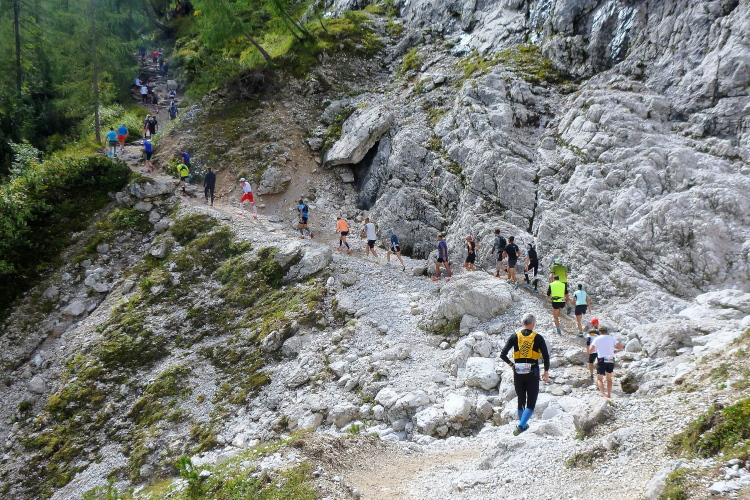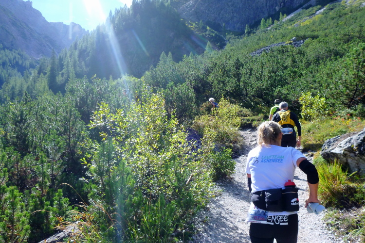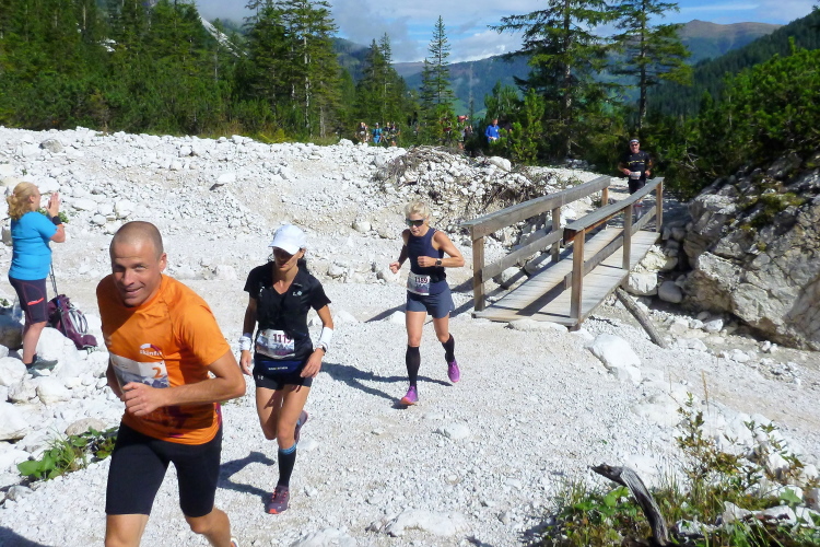 Gute sieben km sind geschafft, die Rest-km nunmehr schon nur noch einstellig, als uns an der Talschlußhütte (1.548 m) schon der zweite VP, diesmal auch mit fester Nahrung, beglückt. Wie immer, insbesondere auf einer solch vergleichsweisen Kurzstrecke, halte ich mich ausschließlich an Flüssiges. Noch laufe ich unverdrossen, weiß aber, dass das bald ein Ende haben wird. Landschaftlich wird es immer besser, so, wie ich es liebe: Steinig, Brücken, Latschenkiefern zu beiden Seiten. Mein Hang zum 1. FC Kaiserslautern, endlich wieder in die 2. Liga aufgestiegen und sich dort wacker schlagend, begründet meinen besonderen Bezug zu diesem Gewächs (ein Hersteller von Latschenkieferbalsam ist Trikotsponsor des FCK). Und dann ist tatsächlich nicht Schluss mit lustig, aber doch mit dem Laufen, meine Preisklasse befindet sich unisono in demütigem Wanderschritt. Längst ist der feine Schotter von grobem, unregelmäßigem Gestein abgelöst worden.