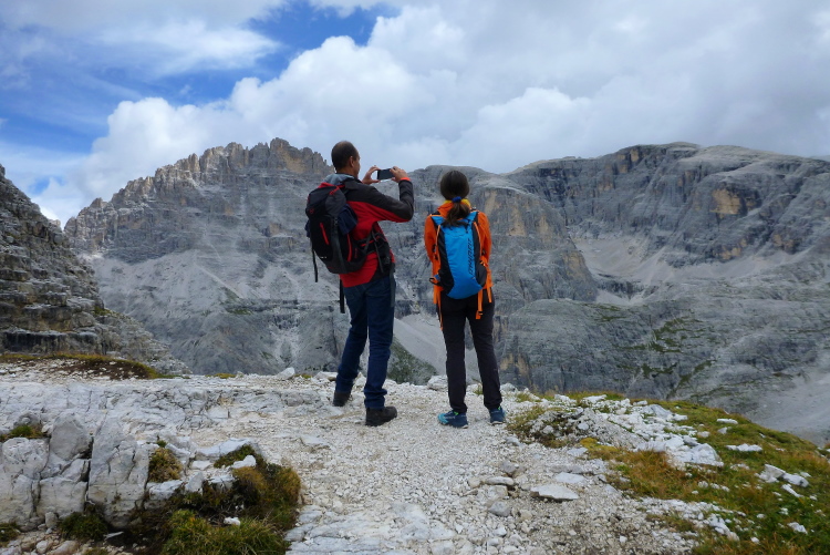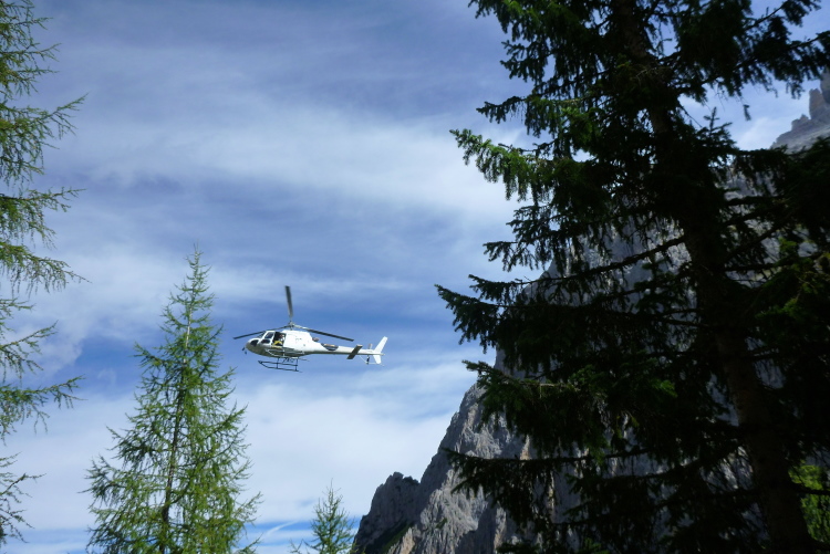 In Serpentinen zieht sich der Weg weiter bergan, Bergretter bewachen unseren Aufwärtsdrang. Also die richtigen, nicht Markus, Tobias und Katharina aus der Serie. Klasse ist bereits der Blick talabwärts zurück. Ich liebe Berge, falls ich es nicht schon mehrfach ex- und/oder implizit geäußert haben sollte. Stramm aufwärts unterstützt die eine oder andere gezimmerte und mit Steinen gefüllte Treppe unser Fortkommen. Anspruchsvoll ist es teilweise, nichts Gefährliches, aber Aufpassen sollte man schon. Grandios ist unverändert das Wetter, kühl zwar in den Schattenpassagen, aber immer wieder mild, sobald ich in die Sonne komme. Kurze Abwärtspassagen werden zum Schwungholen genutzt. Schuttberge werden durchquert, sie zeugen vom ganz langsamen Vergehen dieser Landschaft über die Jahrtausende. Zehn km sind geschafft, deren sieben, die es in sich haben werden, harren noch der Bewältigung. Wir nähern uns der Baumgrenze, mit lautem Geknatter wacht „Michi“ über unseren Köpfen, jederzeit heldenhaft zum Eingreifen bereit.