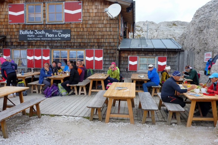 Kein Klagen, Wolfgang, genau deswegen bist Du angereist! Ach, es ist so schön, traumhaft ist die Rundumsicht, auch weitestgehend ohne Sonne. Ah, da sehe ich sie, den letzten Ort der Begierde vor dem Ziel! Näher und näher kommt sie, die Büllelejoch-Hütte auf 2.528 m. Wieder gibt es das volle Programm, ich schwelge u.a. in Orangenschnitzen und Cola, lasse einige Zeit beim Verpflegen liegen. Aber wen interessiert das? Noch eine Stunde zur Dreizinnenhütte weist der Wegweiser aus, als ich mich dann endlich losreiße. Eine Zeit, die ich doch hoffentlich nicht benötigen werde.