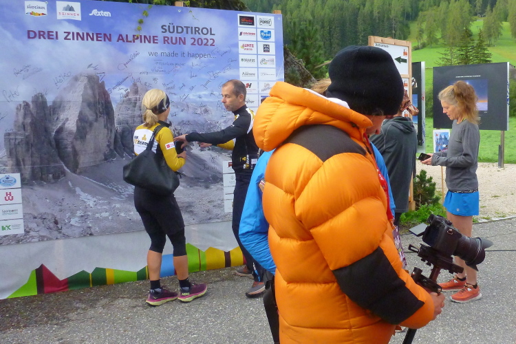 Am nächsten Morgen sieht die Sache mit dem Wetter schon sehr viel besser aus, es ist erträglich mild und vor allen Dingen trocken, woran sich bis zum Nachmittag nichts ändern soll. Früh vor acht Uhr, mehr als zwei Stunden vor dem Start, bin ich mit unseren Fans Iris, Barbara und Elke erneut am Haus Sexten, denn ihr Shuttlebus fährt früh um 8 Uhr ab. Von der Auronzohütte werden sie zudem noch fünf km zur Dreizinnenhütte marschieren dürfen. Auf der Videowand zeigt man uns Live-Bilder vom Ziel, der Ort unserer Sehnsucht zeigt sich bei noch leichtem Frost wolkenfrei vor stahlblauem Himmel, ein Traum. Ein Traum, von dem uns noch 17 km mit 1.333 HM trennen, denn dass es auf die Originalstrecke gehen kann, steht außer Frage. Eine halbe Stunde vor dem Start sind alle Rucksäcke abgegeben, die Ersten trollen sich in den Startbereich. Als mutig empfinde ich die ganz in Kurz laufenden Kollegen, ich habe mich für je ein Lang- und Kurzarmshirt entschieden und werde damit am Ende für mich richtig gelegen haben.