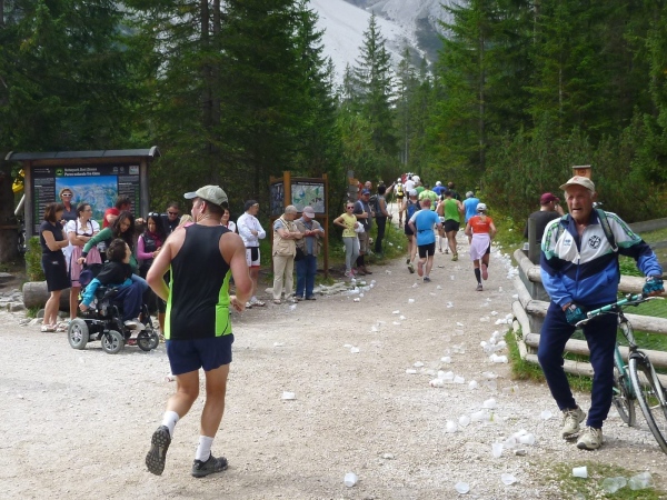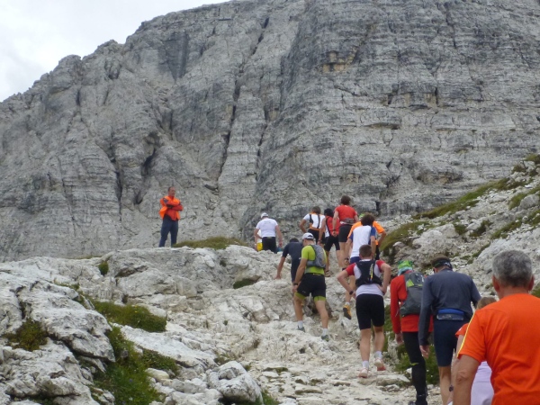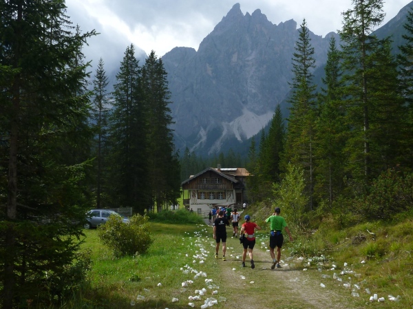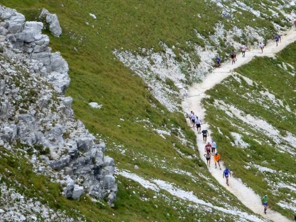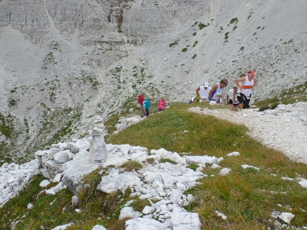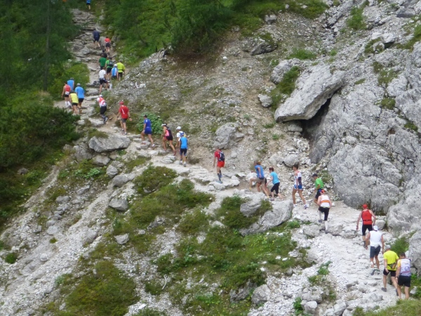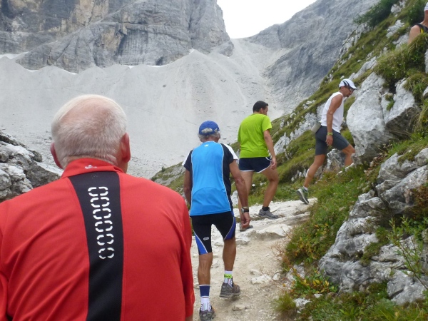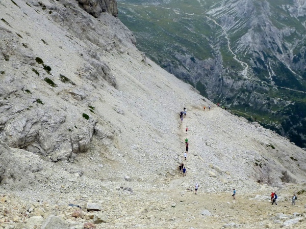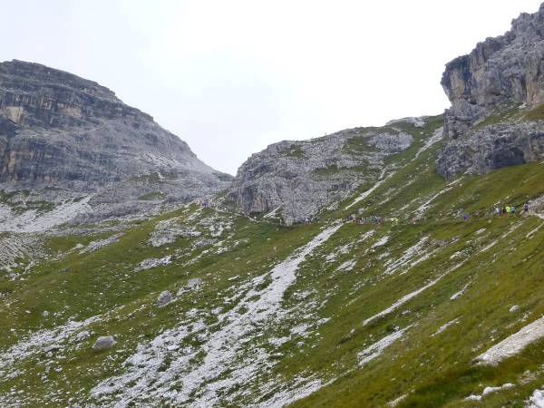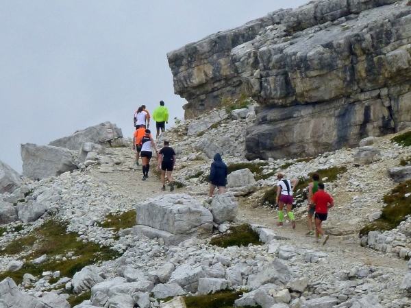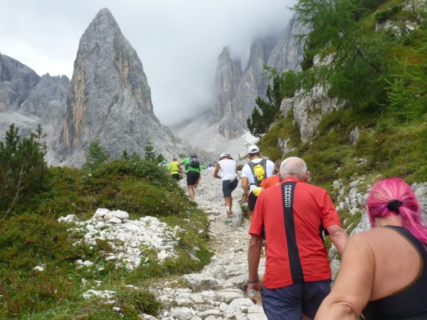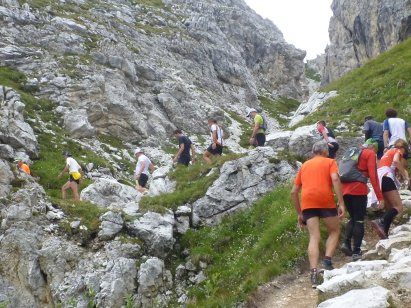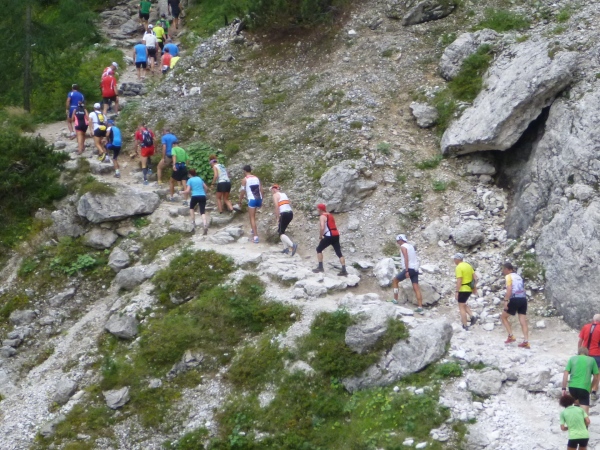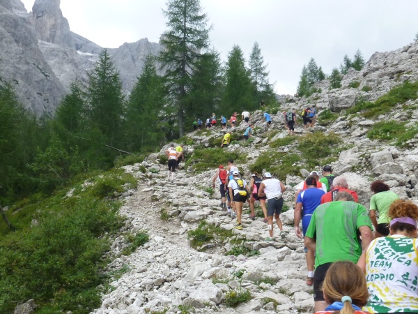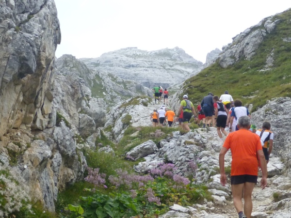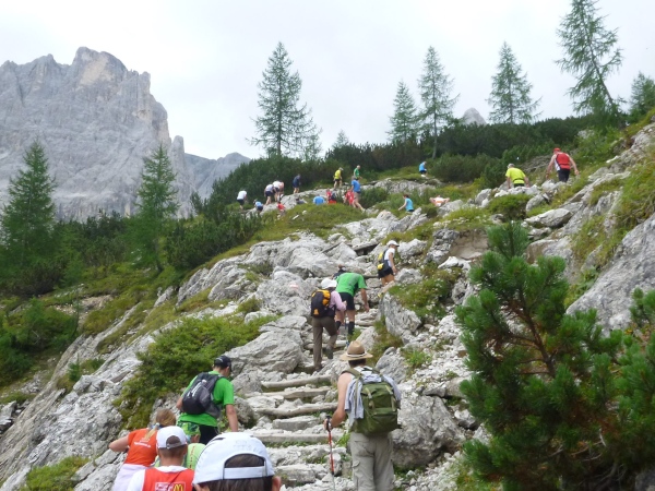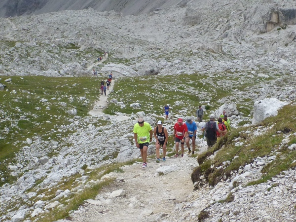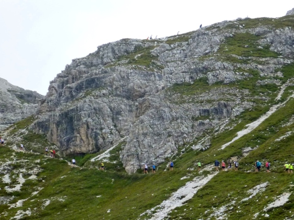 An der Talschlusshütte (Rif. Fondo Valle, 1548 m) ist es mit dem lockeren Laufen vorbei. Jetzt bei km 8,5 geht es richtig los. Schon eine Weile sieht man von Weitem die Läuferschar am Berg. In Serpentinen geht es durch Latschenkiefern aufwärts. Judith machte mich gestern Abend darauf aufmerksam, dass es auf einer Entfernung von 5,5 km 1000 Höhenmeter zu überwinden gilt. Also ist zügiges Gehen angesagt. Spaziergänger sind übrigens auch unterwegs. Bei Läufern führen Stöcke zur Disqualifikation. Bei den Wanderern gehören sie zur Standardausrüstung.