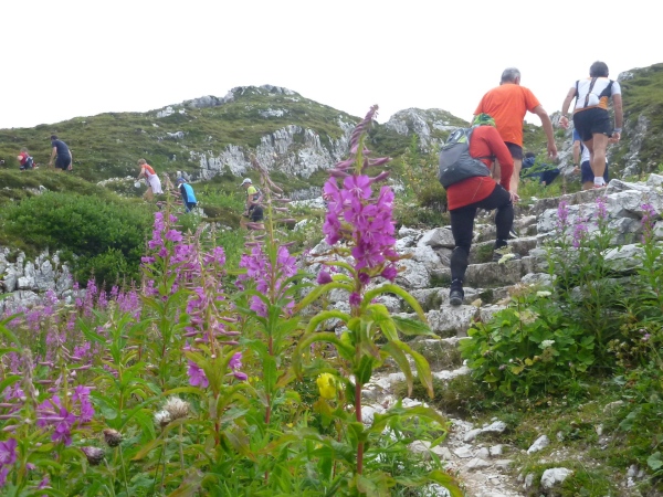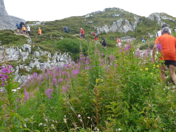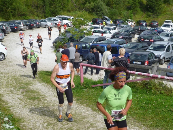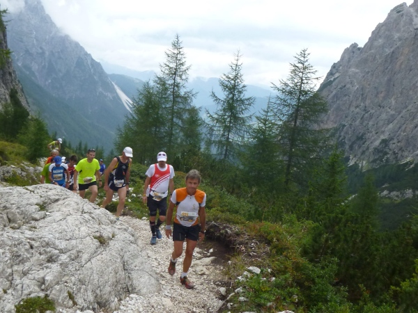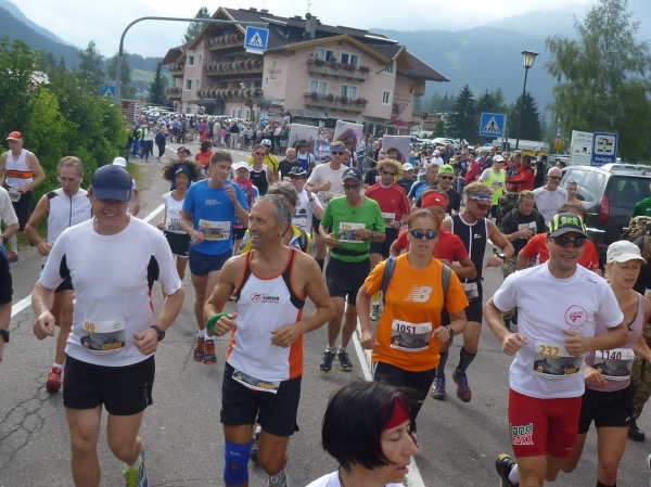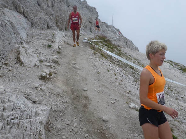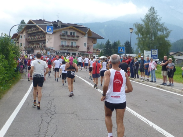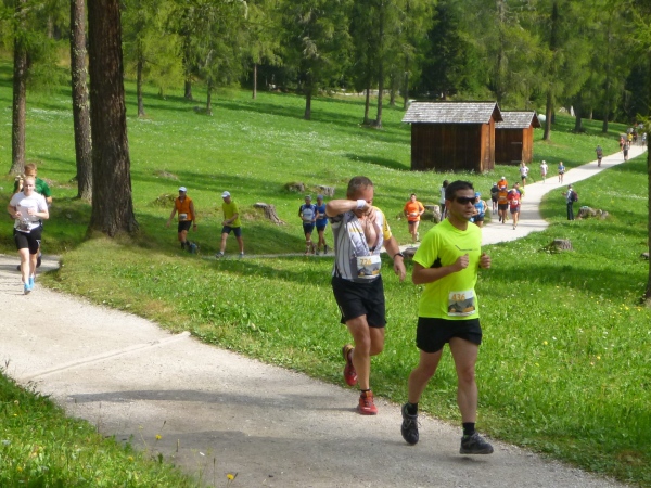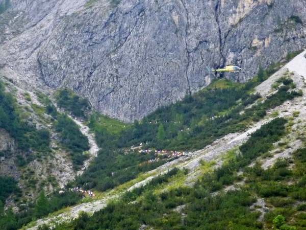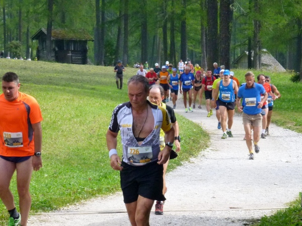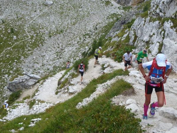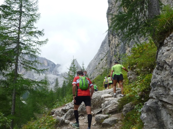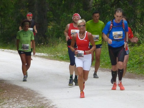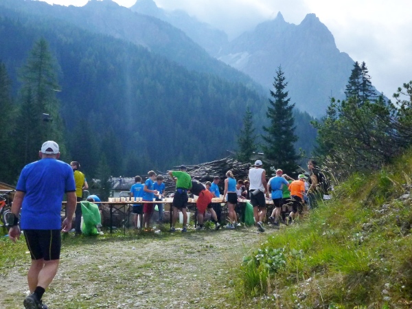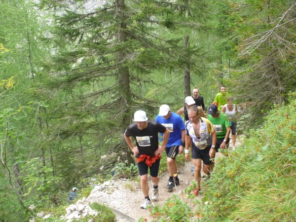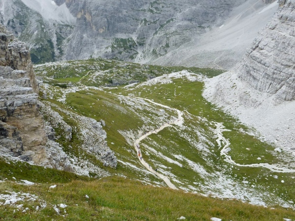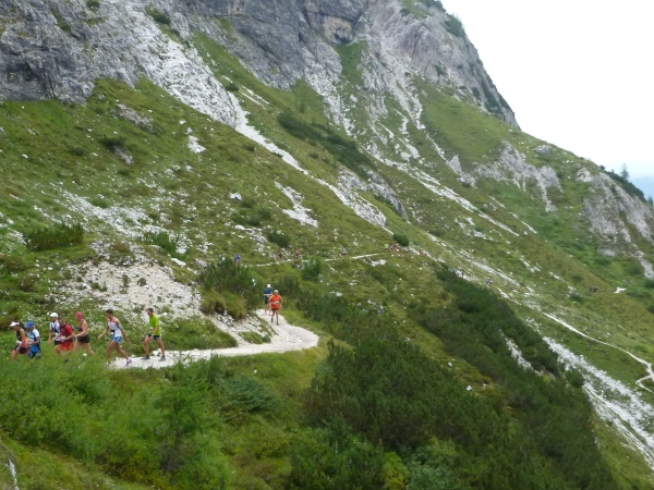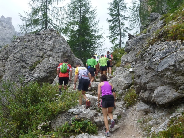 An der Talschlusshütte (Rif. Fondo Valle, 1548 m) ist es mit dem lockeren Laufen vorbei. Jetzt bei km 8,5 geht es richtig los. Schon eine Weile sieht man von Weitem die Läuferschar am Berg. In Serpentinen geht es durch Latschenkiefern aufwärts. Judith machte mich gestern Abend darauf aufmerksam, dass es auf einer Entfernung von 5,5 km 1000 Höhenmeter zu überwinden gilt. Also ist zügiges Gehen angesagt. Spaziergänger sind übrigens auch unterwegs. Bei Läufern führen Stöcke zur Disqualifikation. Bei den Wanderern gehören sie zur Standardausrüstung.
