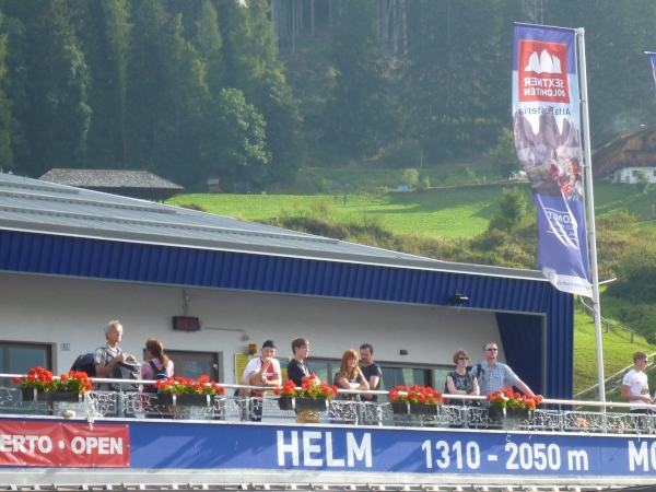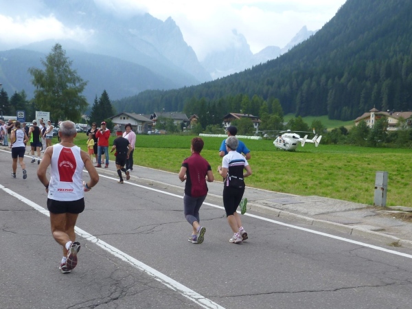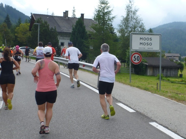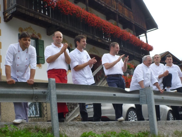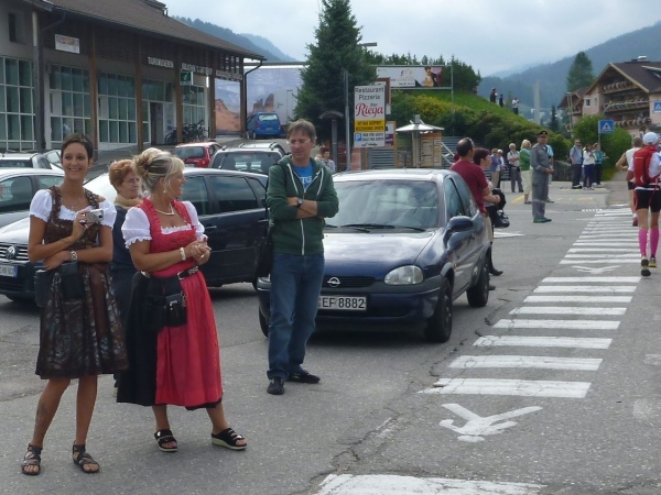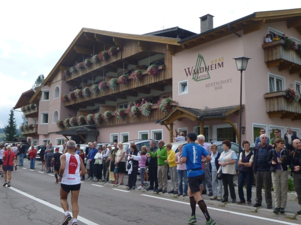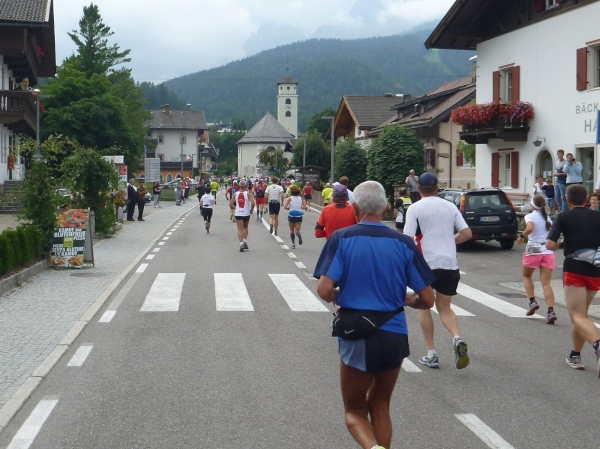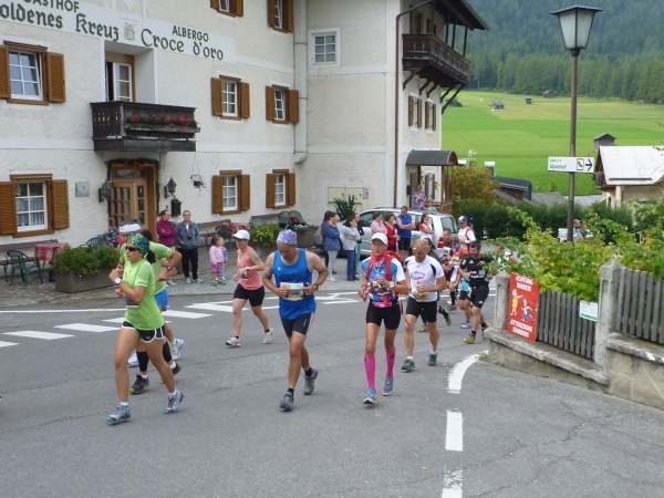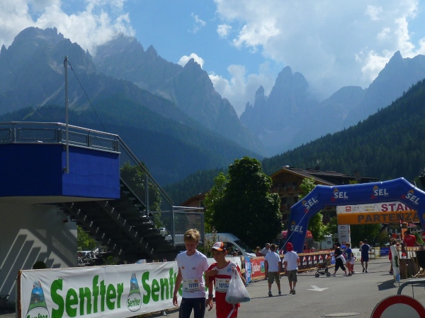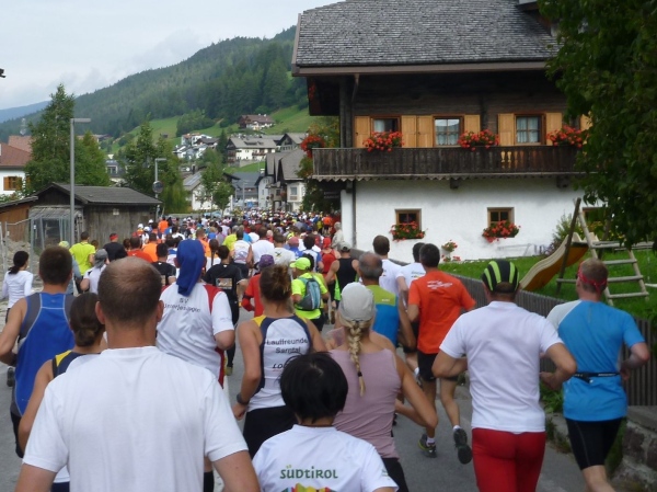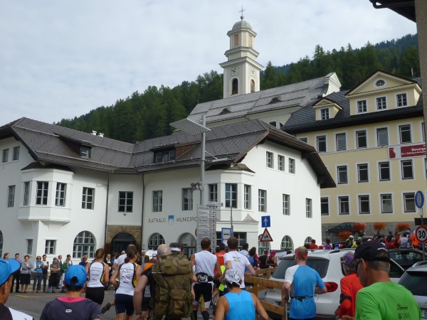 Bevor es so weit ist, führt der Moderator Interviews mit den Favoriten. Pünktlich um 10:00 Uhr geht es dann los. Tausend Läuferinnen und Läufer sind unterwegs. Zuerst eine Schleife durch den Ort Sexten, um nach 2 Kilometern noch mal am Start vorbeizukommen. Da stehen natürlich viele Zuschauer. Und die ersten paar Höhenmeter sind fällig. Kurz danach passieren wir die Gemeinde Moos. Vor einem Hotel schauen uns die Köche zu, hoffentlich brennt da nichts an!