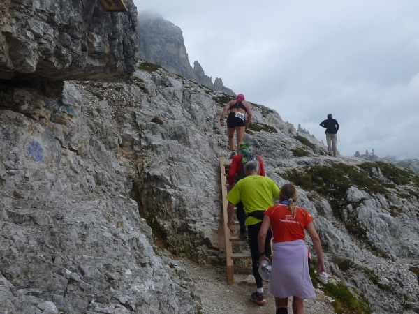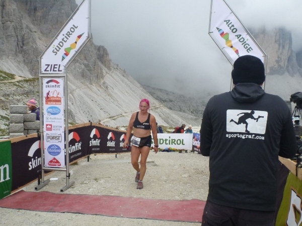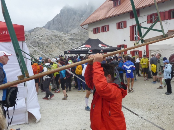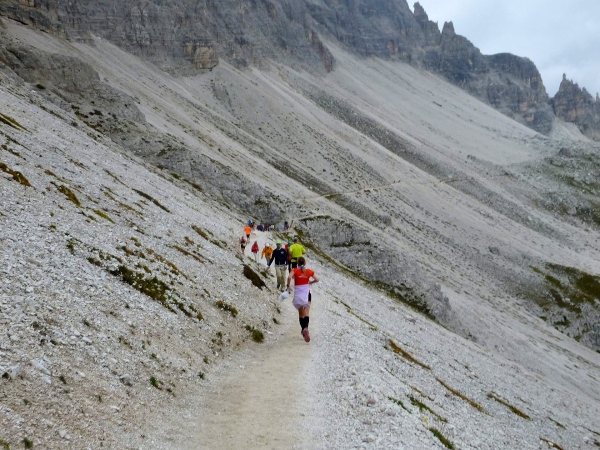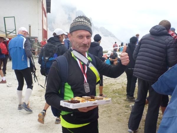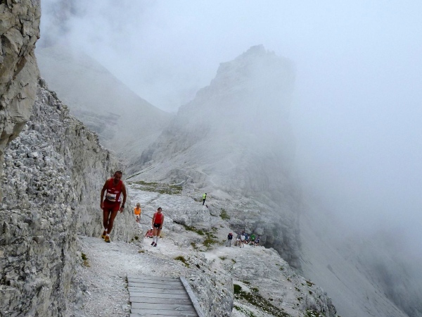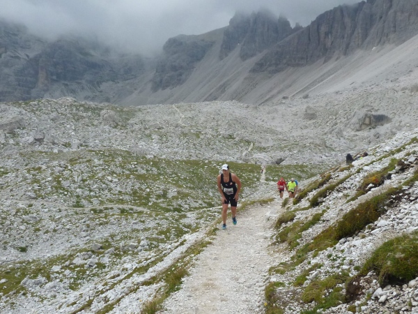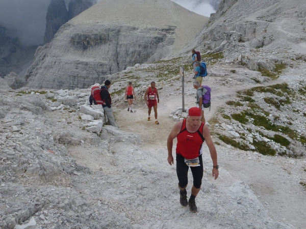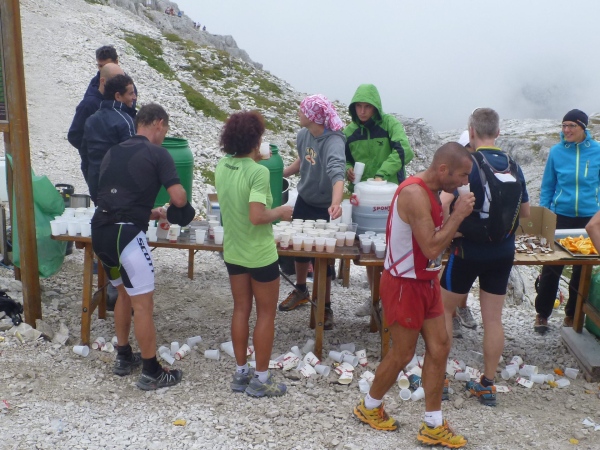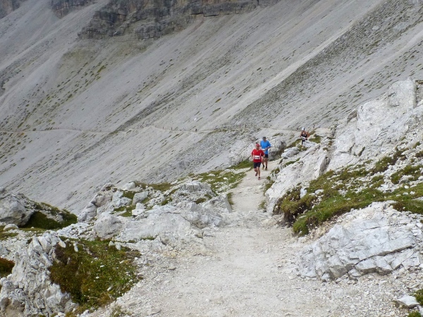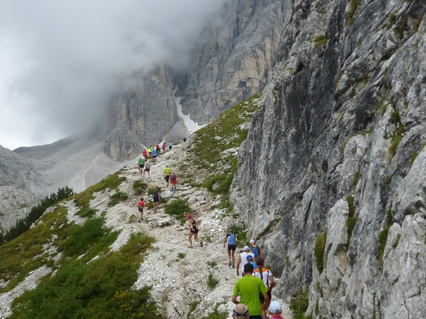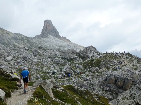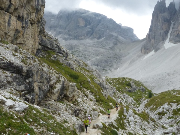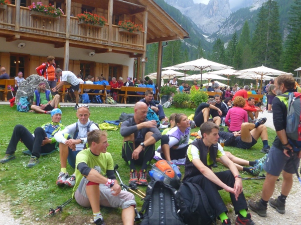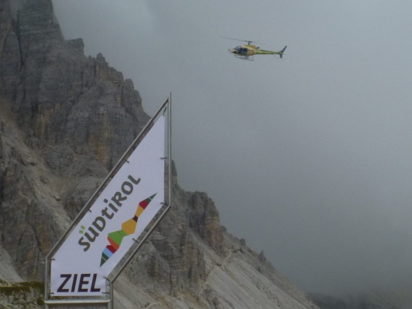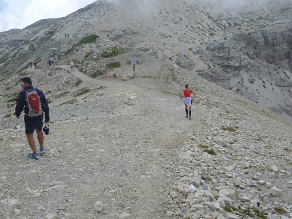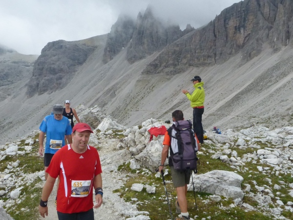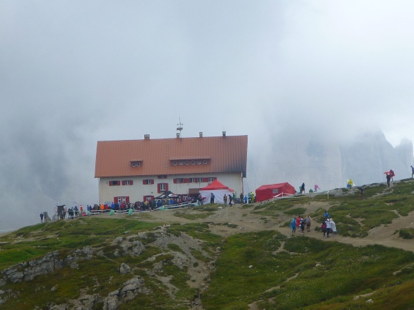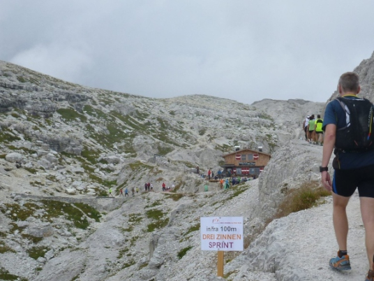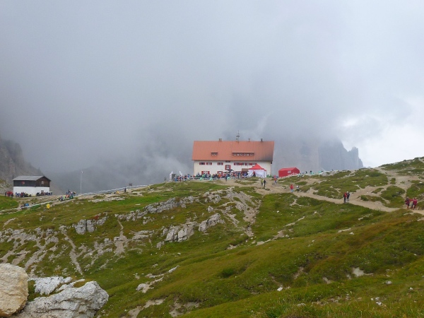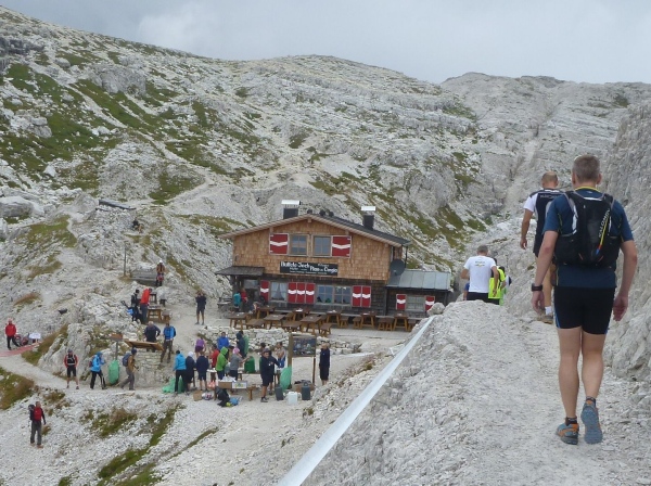 Die Steigung nimmt ab und es geht fast flach dahin. Der letzte Kilometer wird angekündigt, lange bevor er beginnt. Eine Schulklasse aus Deutschland, die uns entgegenkommt, macht richtig Stimmung und Gott sei Dank auch Platz. Auf dem letzten halben Kilometer müssen wir dann noch mal 50 Meter aufwärts, wobei wir einige schnelle Bergabläufer wieder „einsammeln“. Ziel ist die Drei-Zinnen-Hütte (Rif. Antonio Locatelli, 17,2 km, 2405 m) vor dem gleichnamigen Gebirgszug, der sich leider in Wolken hüllt. Der Zieleinlauf ist so ausgerichtet, dass es fantastische Bilder geben könnte. Daraus wird nichts, zumindest nicht für uns. Anhand der Webcam-Fotos stellen wir hinterher fest, dass wir für eine schöne Aussicht eine Stunde zu spät dran waren – ein Grund mehr, in Zukunft doch noch etwas am Tempo zu arbeiten.