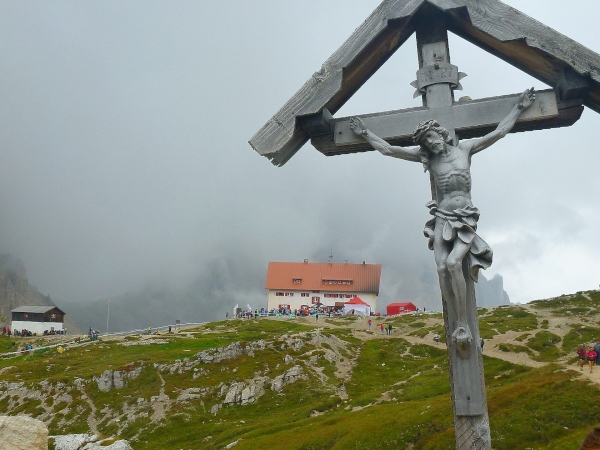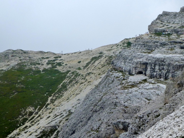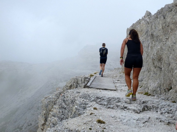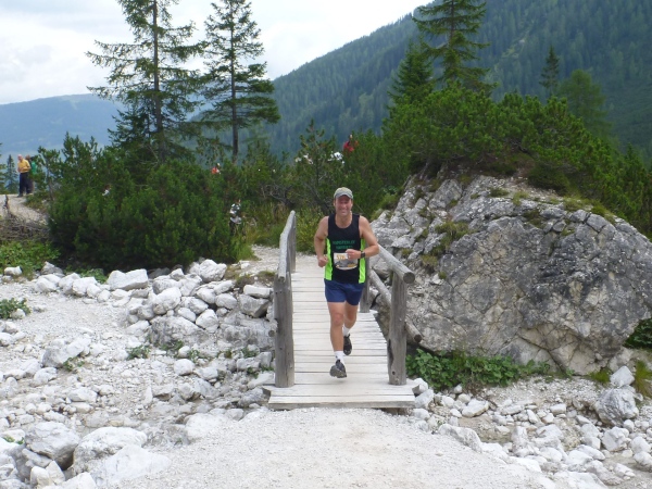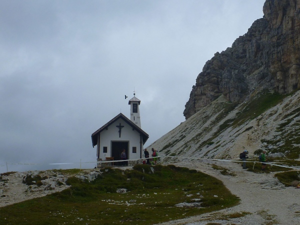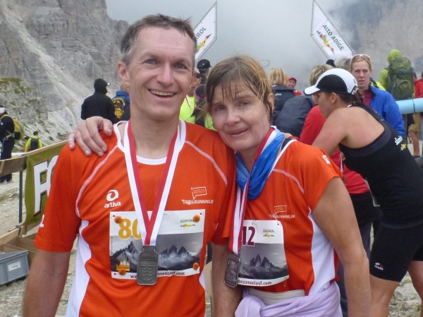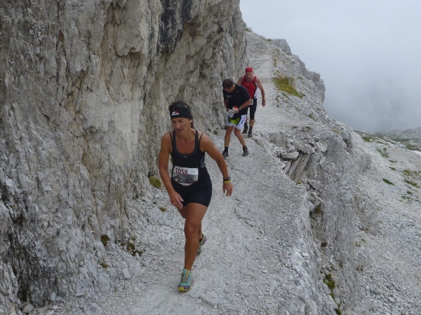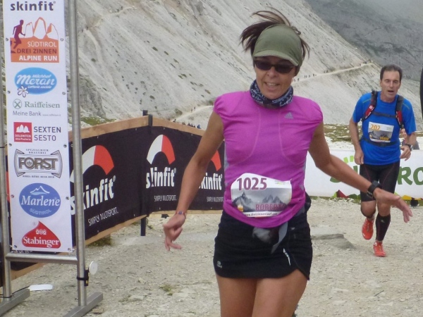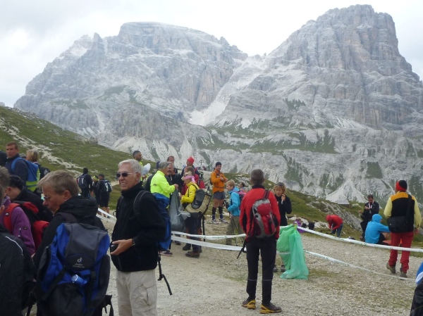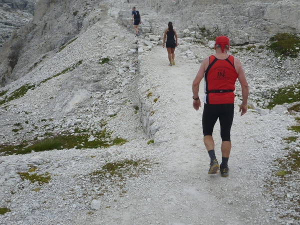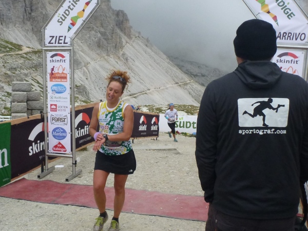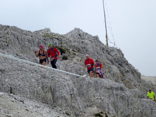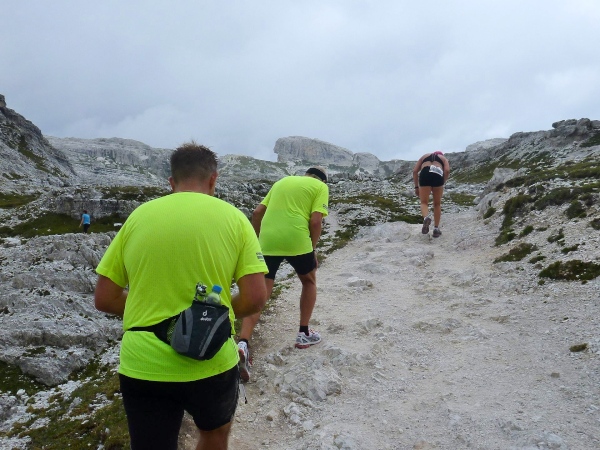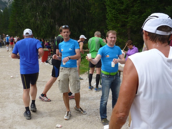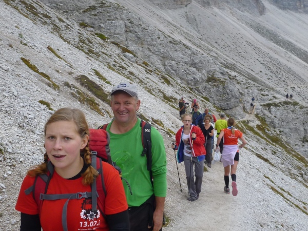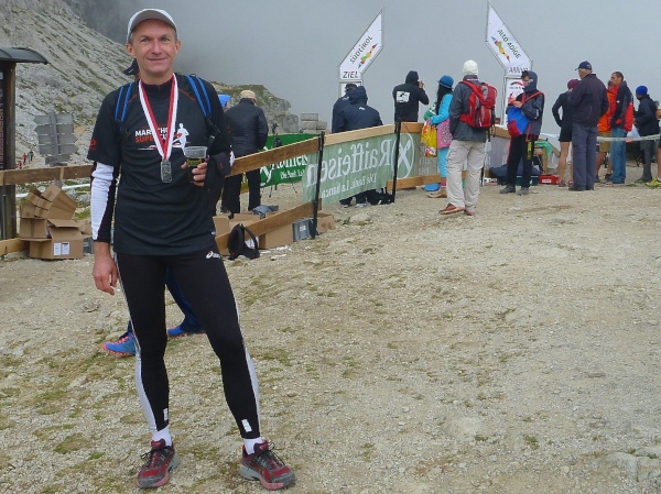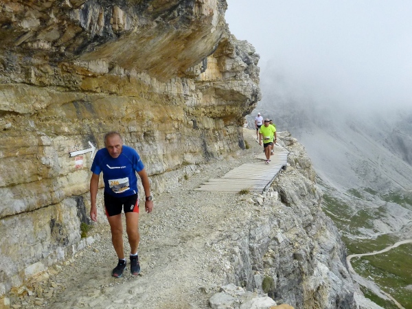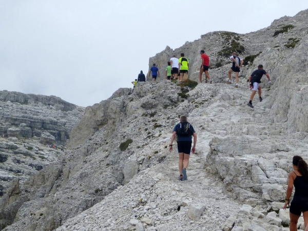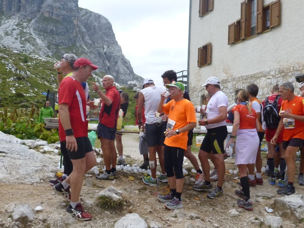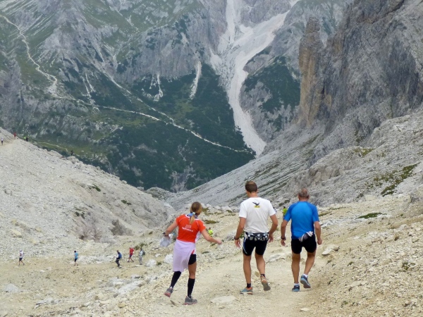 Die Steigung nimmt ab und es geht fast flach dahin. Der letzte Kilometer wird angekündigt, lange bevor er beginnt. Eine Schulklasse aus Deutschland, die uns entgegenkommt, macht richtig Stimmung und Gott sei Dank auch Platz. Auf dem letzten halben Kilometer müssen wir dann noch mal 50 Meter aufwärts, wobei wir einige schnelle Bergabläufer wieder „einsammeln“. Ziel ist die Drei-Zinnen-Hütte (Rif. Antonio Locatelli, 17,2 km, 2405 m) vor dem gleichnamigen Gebirgszug, der sich leider in Wolken hüllt. Der Zieleinlauf ist so ausgerichtet, dass es fantastische Bilder geben könnte. Daraus wird nichts, zumindest nicht für uns. Anhand der Webcam-Fotos stellen wir hinterher fest, dass wir für eine schöne Aussicht eine Stunde zu spät dran waren – ein Grund mehr, in Zukunft doch noch etwas am Tempo zu arbeiten.