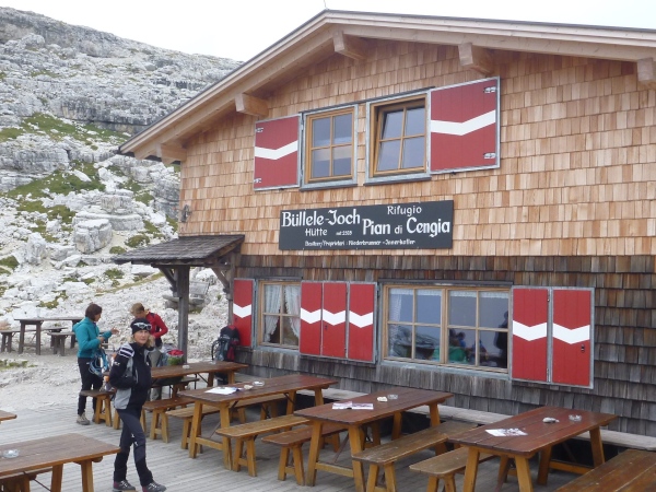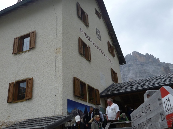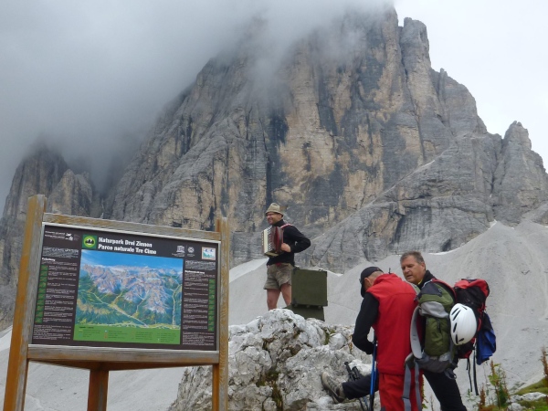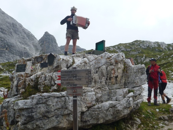 Auf der Zsigmondyhütte (Rif. Comici km 12, 2224 m) werden wir mit Musik empfangen. Woher die Namen für die Hütte stammen? Erwin Zsigmondy war ein Wiener Alpinist und Emilio Comici ein italienischer Alpinist. So einfach ist das.