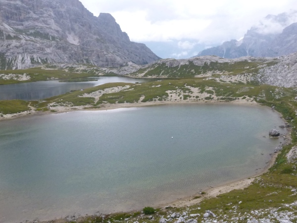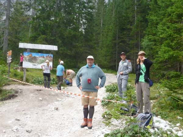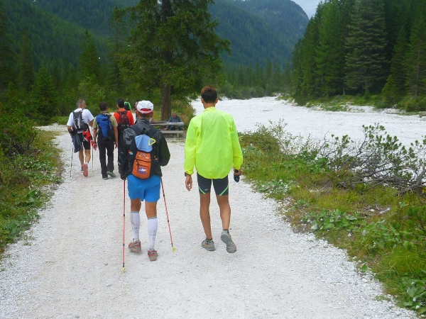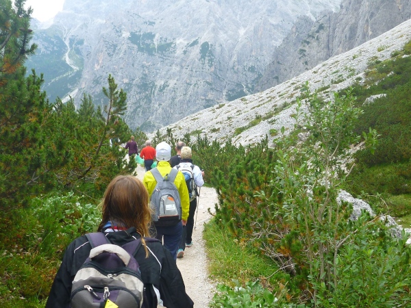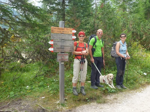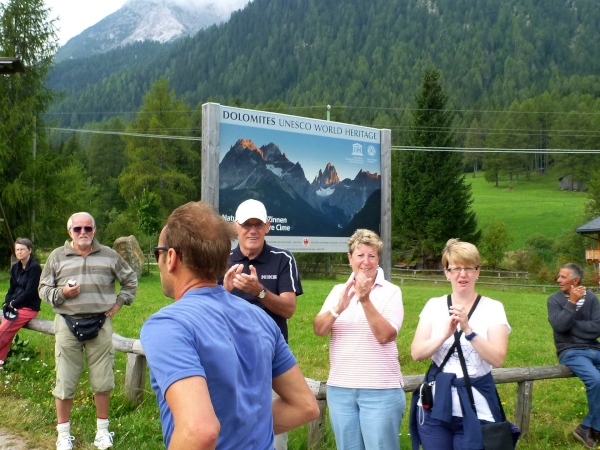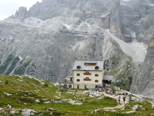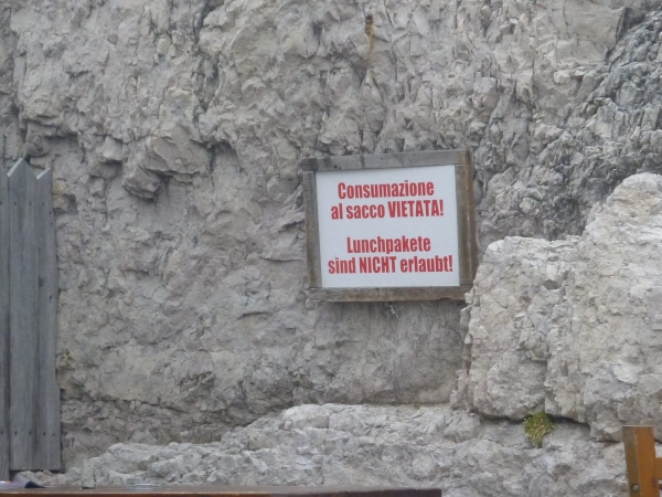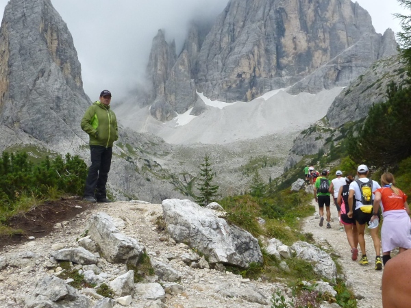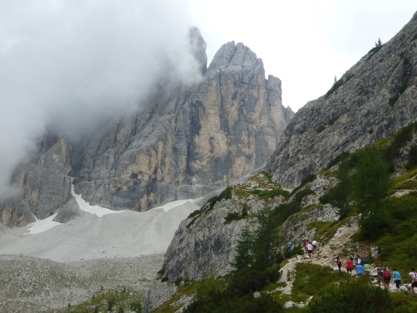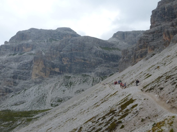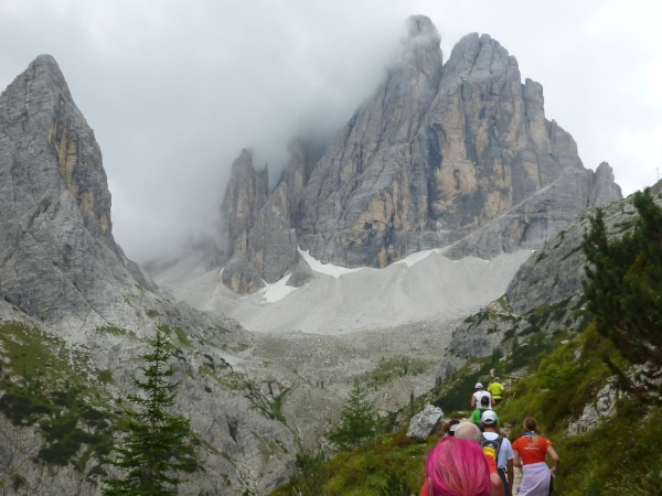 Die letzten heißen Sommertage sind noch zu spüren. Der Schweiß läuft in Strömen. Leider hängen über den Gipfeln immer noch dunkle Regenwolken. Bei km 3,5 verlassen wir den Teerweg und betreten das „Unesco-Weltnaturerbe Dolomiten“. Es geht gemächlich bergan. An der Fischleinbodenhütte (Rifugio Piano Fiscalino) ist die erste Verpflegungsstelle. Bis hierher kann man mit dem Auto fahren. Viele Wanderer sind unterwegs, es gibt ausreichend Picknickplätze. Schön ist es hier.