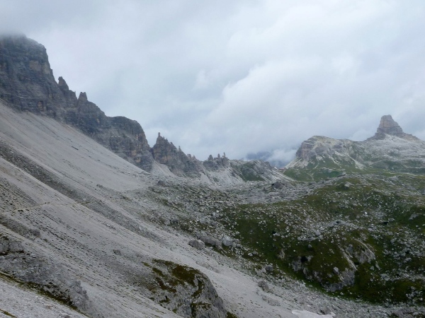 So bei km 10 (1900 m) kommen wir dann ins baumlose Gelände. Jetzt wird es monumental. Linker Hand mehrere Dreitausender. Wir laufen im Uhrzeigersinn um den Einser (Cima Una). Man muss ja nicht jedem Berg einen Namen geben, und so zählt man hier die bizarren Gipfel durch bis zum Zwölfer, der wenigstens auf Italienisch „Croda di Toni“ heißt.
