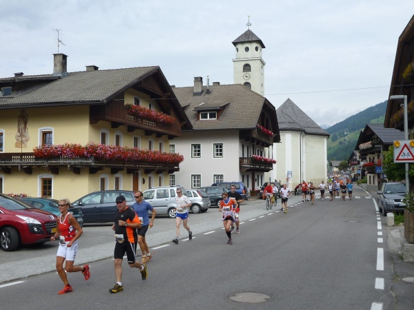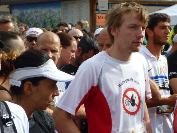 Ein italienischer Läufer erkundigt sich, ob unsere T-Shirts vom Dolomitenmann stammen, bei dem gestern im nahen Lienz Viererteams aus Bergläufern, Paraglidern, Wildwasserkajak und Mountainbikern starteten. Aber so verrückt sind wir dann doch nicht. Bei unserer Ausrüstung handelt es sich um die neuen Trikots von Trailrunning.de. Aber gut, dass sie auffallen.