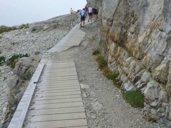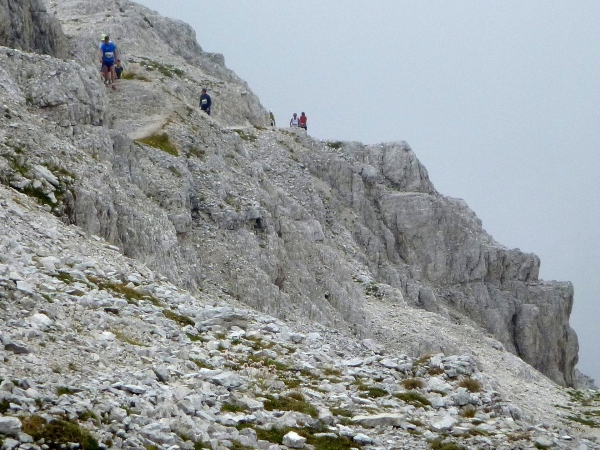 Wir werden gut verpflegt und frisch gestärkt geht es weiter bergan. Gerd meint grinsend, dass wir die nächsten 5 Kilometer in einer halben Stunde hinter uns haben. Da bin ich dabei! Es beginnt etwas flacher und man glaubt, bald die höchste Stelle erreicht zu haben. Dafür entfaltet sich jetzt eine spektakuläre Landschaft, was beim Laufen zunächst gar nicht so auffällt. Der Weg ist nun ausreichend breit und lässt viel Platz zum Überholen (oder Stehenbleiben zum Fotografieren – und das tun außer mir auch noch einige Mitläufer). Ich bin beeindruckt, als ich später meine Fotos ansehe: So ausgesetzt kam mir das „in natura“ gar nicht vor. Wer nicht an sehr starker Höhenangst leidet, braucht sich aber wegen des Weges keine Sorgen zu machen. Lediglich sehr gute Trailschuhe sind ein Muss.