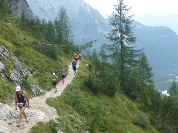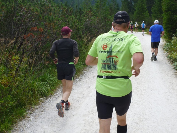 Beendet ist unsere sportliche Aktivität noch nicht: Jetzt folgen1,5 km Abstieg zur 1000 m tiefer gelegenen Fischleinbodenhütte - ohne Zeitnahme. Läufer wie Wanderer legen den Weg im Gänsemarsch zurück. Überholen ist meist nicht möglich. Eine langsame Wandergruppe hält uns lange auf. Platz macht man eher ungern. Als es wieder wärmer wird, zieht der Papi sogar seine Jacke im Gehen aus, nur um niemanden vorbeilassen zu müssen.