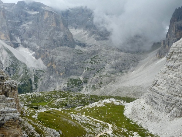 Vor 200 Millionen Jahren war hier noch Meer. Die Dolomiten bestehen im Wesentlichen aus Kalkablagerungen. Beim Zusammenprall der afrikanischen und europäischen Kontinente entstand dann dieses bizarre Gebirge. Das Ganze ist recht instabil. Durch Erosion und Frost kommt es immer mal wieder vor, dass Felsteile in sich zusammenbrechen.