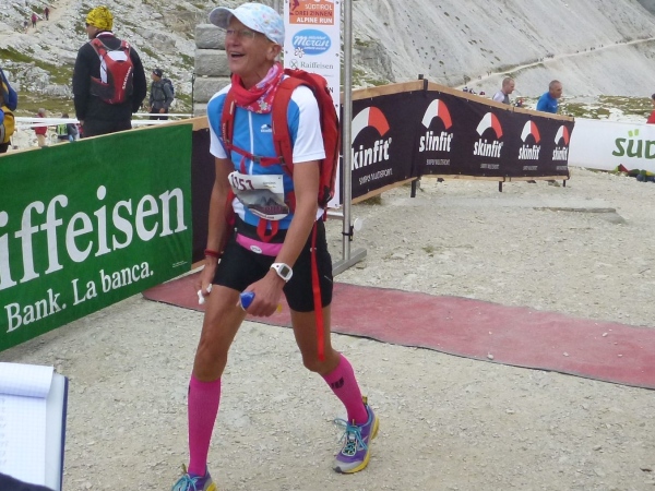 An der Büllelejochütte (Rif. Pian di Cengia, km 14, 2528 m) macht sich ein kalter Wind bemerkbar. Hier beginnt die sogenannte Sprintwertung. Was das bedeutet, werden wir gleich erfahren. Wenig später sind wir an der höchsten Stelle mit 2556 Metern angelangt und müssen auf dem nächsten Kilometer ca. 250 Meter bergab sprinten. Weit unten schimmern die Bödenseen. Der Weg ist ziemlich sandig und rutschig. Einige Läuferinnen und Läufer gehen hier sehr bedächtig hinunter, die erfahreneren(?) rasen/schlittern an uns vorbei, wobei eine Läuferin Judith fast noch mitreißt. Nach meiner Nörgelei bergauf bin ich jetzt recht kleinlaut geworden. Fotos mache ich hier keine. Wir sehen unseren Spaßmacher Gerd zum letzten Mal. Er gehört zu den Schnelleren und ist drei Minuten vor uns im Ziel. In der M70 belegt er mit 2:48:03 den zweiten Platz.