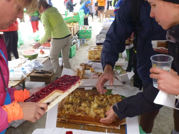 Uns Finisher erwartet im Ziel eine erstklassige Verpflegung mit Getränken, Obst, Joghurt und verschiedenen Kuchensorten – ich nehme an solchen Läufen eigentlich nur wegen des guten Kuchens teil. Unsere Kleidersäcke haben den Flug gut überstanden und wir sind bei sinkenden Temperaturen und beginnendem Regen froh, etwas Warmes und Trockenes zum Anziehen zu haben.