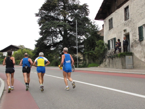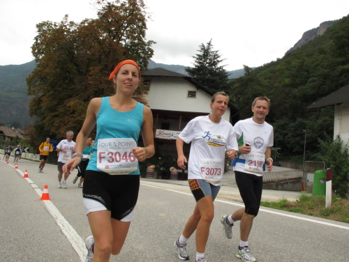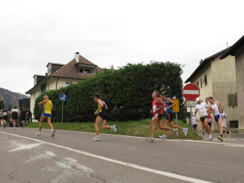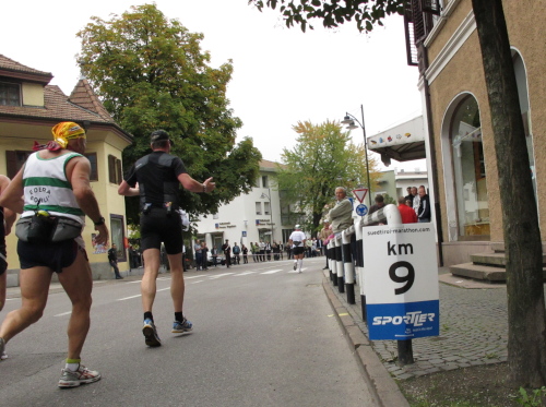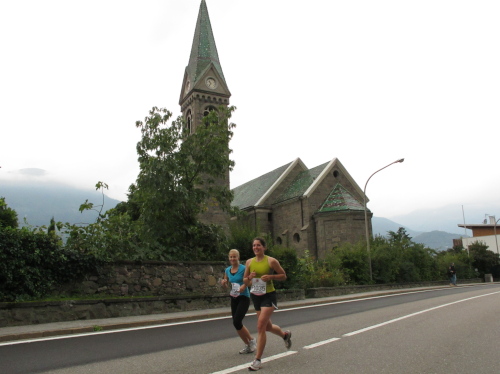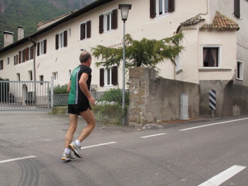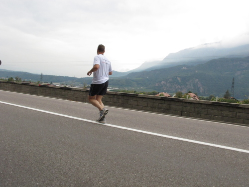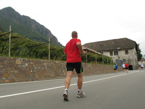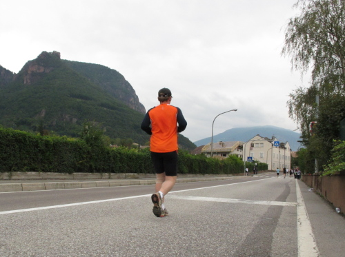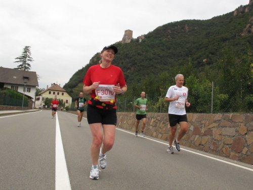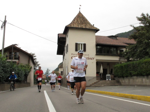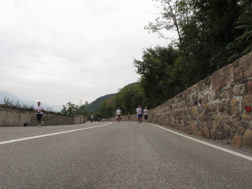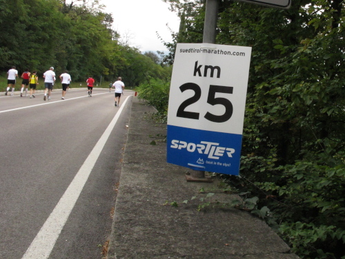Ich bin ganz gut unterwegs und will versuchen, beim Start es Halbmarathons in Terlan zu sein. Dazu müsste ich allerdings eine Zeit hinlegen, wie ich sie dieses Jahr noch nicht gelaufen bin. Weil die Fotostopps aber nicht so häufig sind wie sonst, sehe ich eine Chance.