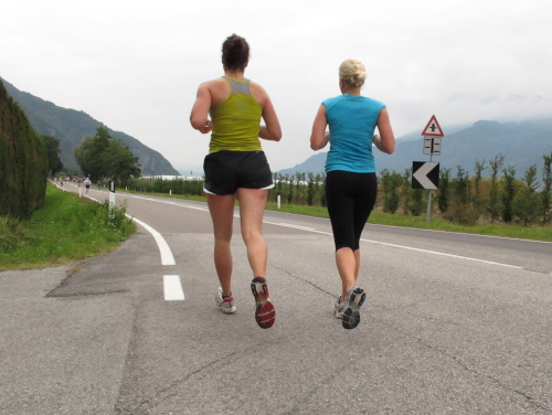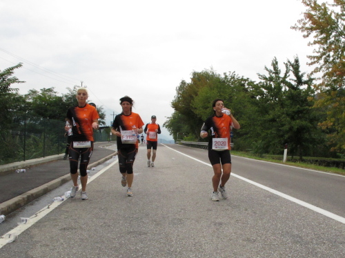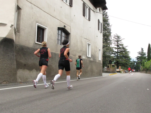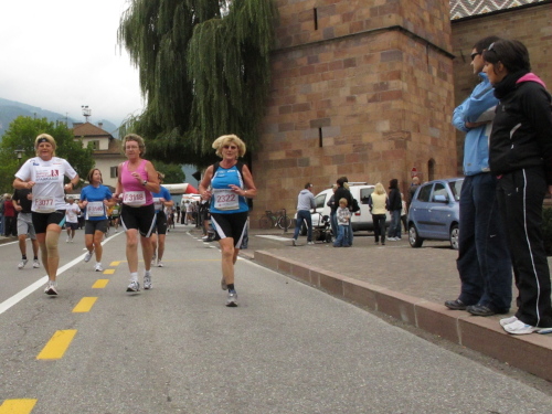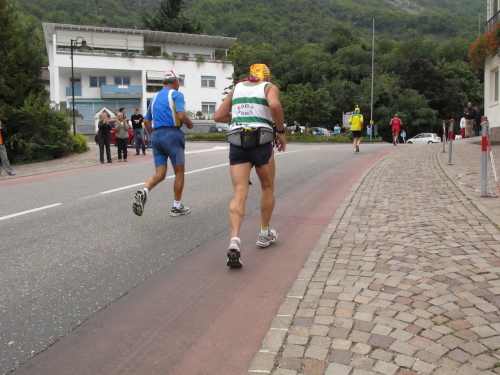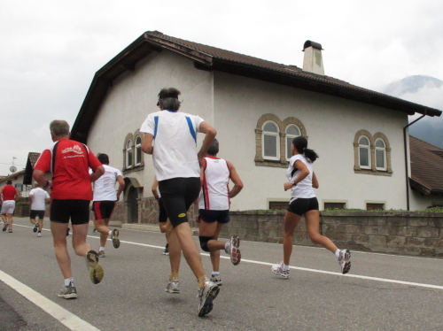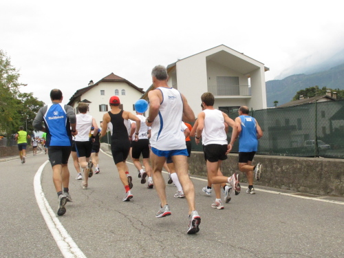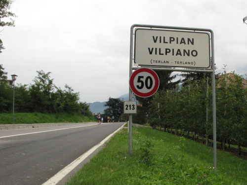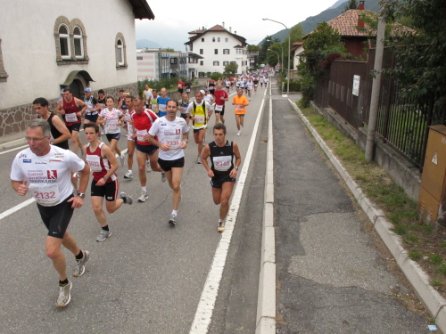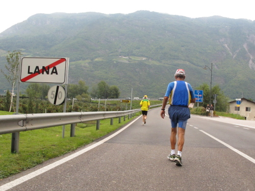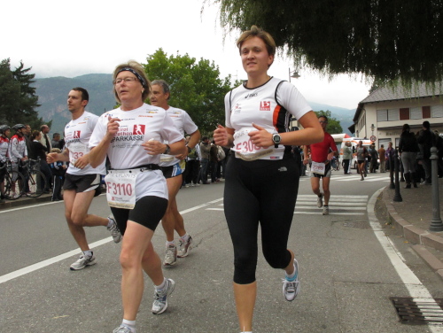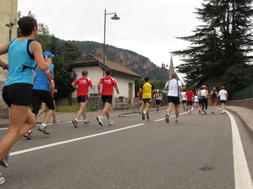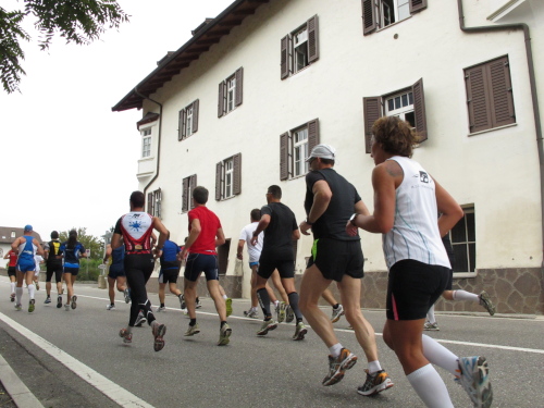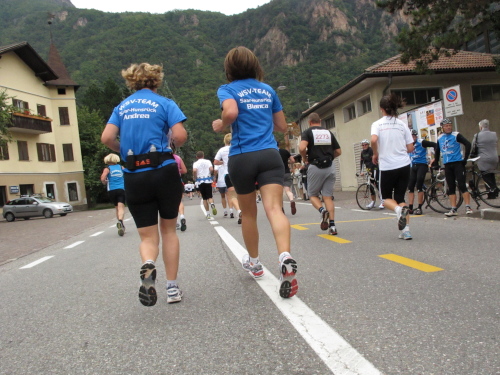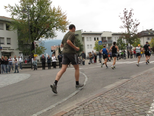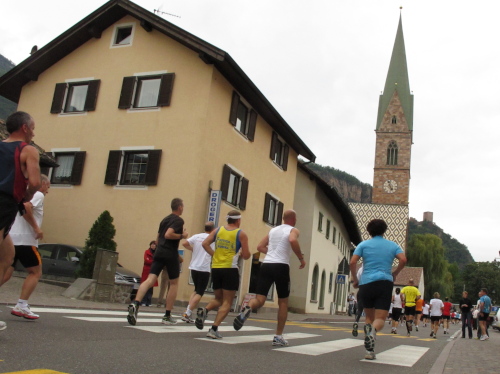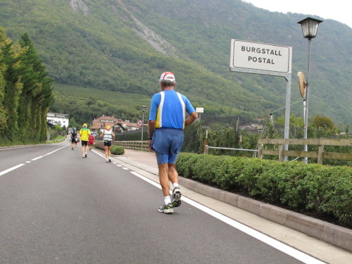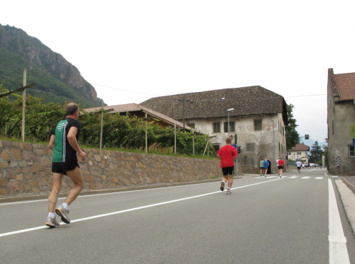 Genau im richtigen Moment sprinten die „Halben“ von rechts auf die alte Staatsstraße und teilen sich von jetzt an die Strecke mit den teilweise schon recht müden Marathonis, die sich auf die linke Fahrbahnseite retten. Jetzt geht so richtig die Post ab. Das große Läuferfeld erreicht den Ort, der ausnahmsweise mehr durch den Wein- als durch den Obstanbau bekannt ist. Auch Spargel ist eine Terlaner Spezialität.