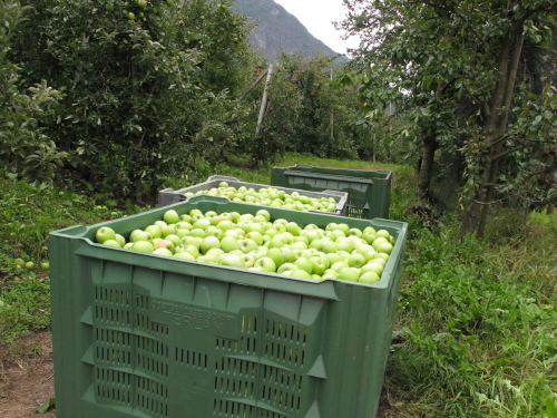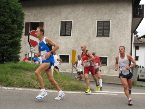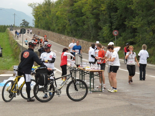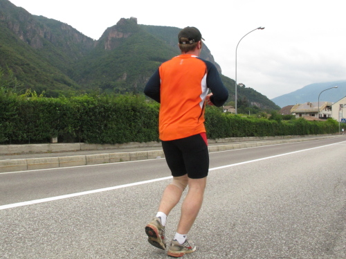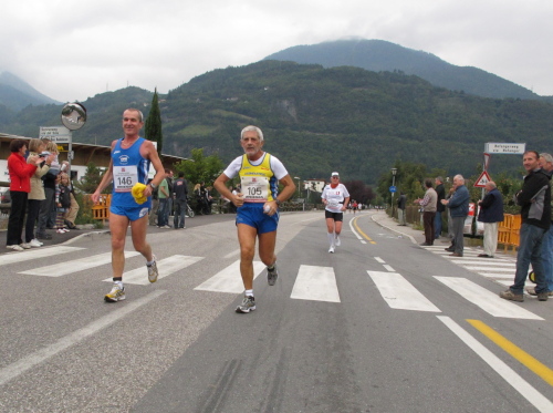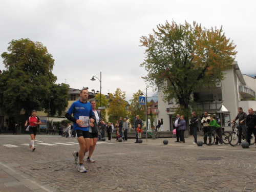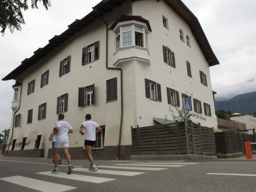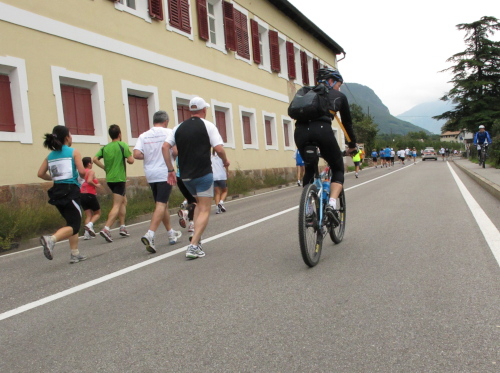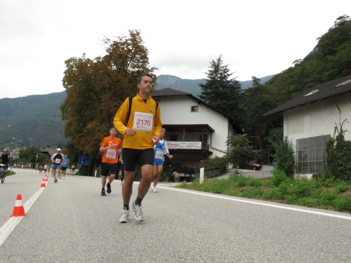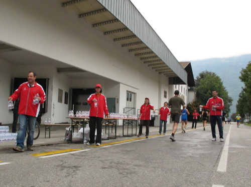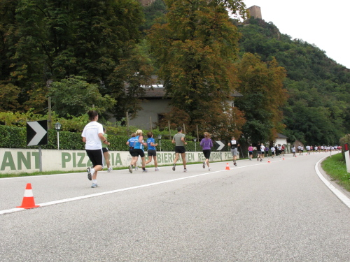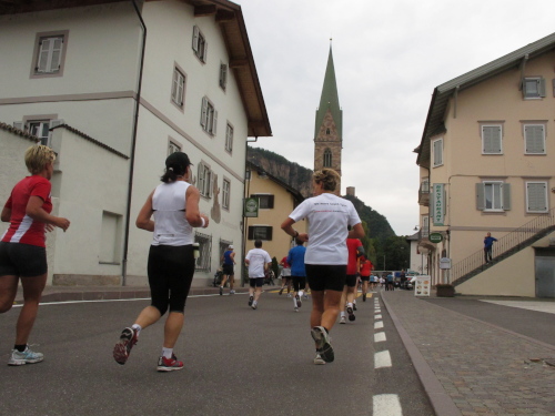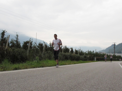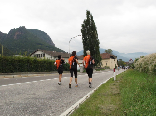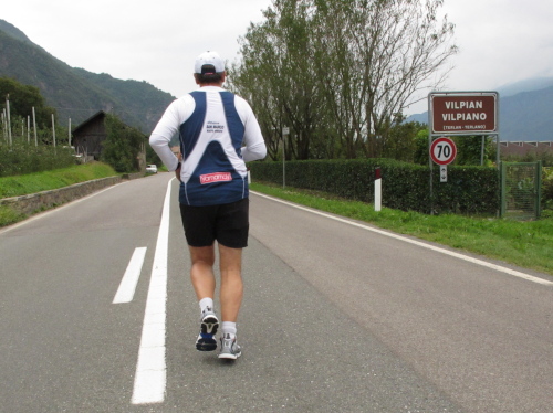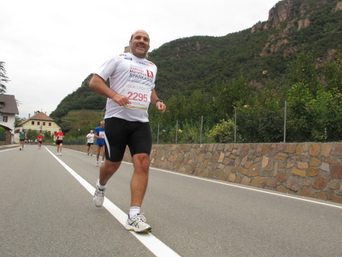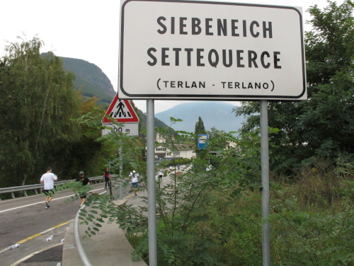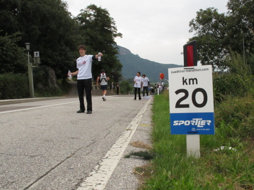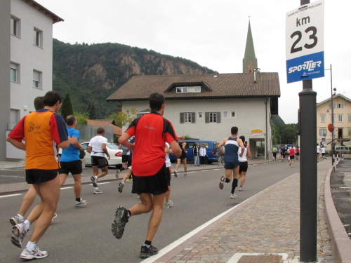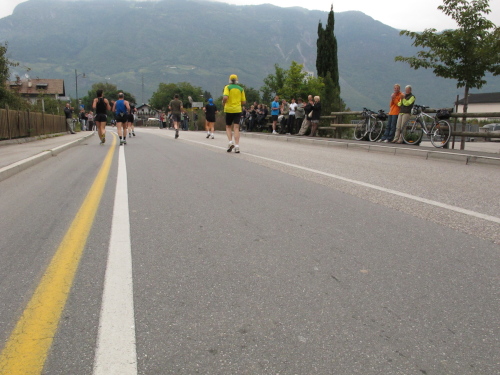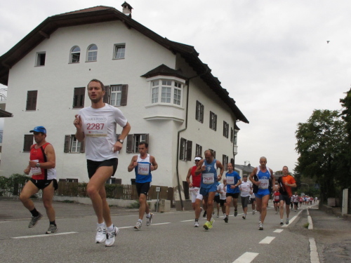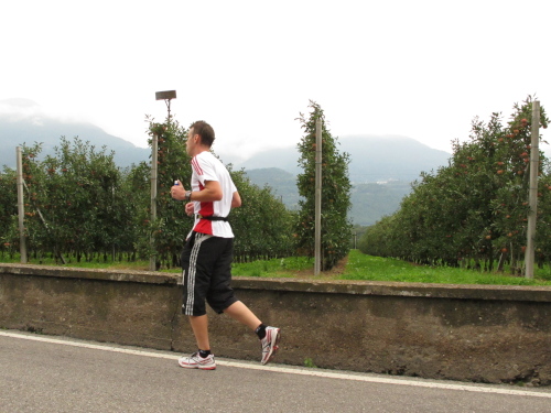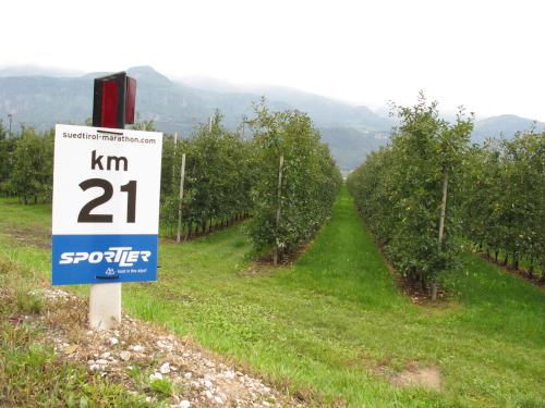 In Südtirol werden jährlich fast 1 Mio. Tonnen Äpfel geerntet. Das sind 12 % der europäischen und 50 % der italienischen Produktion. Die Hälfte geht in den Export und davon 2/3 alleine nach Deutschland. Die beliebtesten Sorten sind Janagold, Idared, Golden Delicius und Gloster. Äpfel sind seit Jahrtausenden ein wertvolles Nahrungsmittel und reich an Mineralstoffen und Vitaminen. So gesehen meinen es die Veranstalter heute gut mit uns, denn an fast jeder Verpflegungsstelle liegen Apfelstücke bereit. Manche sagen, zu gut. Denn zu Essen gibt es sonst fast nichts. Jetzt kann ich endlich meine Taschen leeren, denn bei den letzten vier Marathons blieb die mitgeführte eiserne Riegel-Ration wegen ausreichender Versorgung unangetastet.