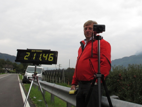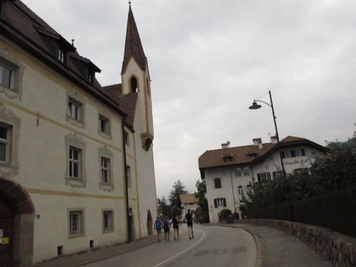 Nach der Brücke, die uns über die Etsch bringt, sehen wir rechts auf der Höhe über den Rebhängen Marling mit der Pfarrkirche und an der Straße erstaunlich viele Zuschauer. Die Berge sind leider in Wolken und das Licht noch immer zu schlecht für einigermaßen gute Fotos. Also lasse ich das Gerät zunächst meist stecken und schaue, dass ich vorwärts komme.