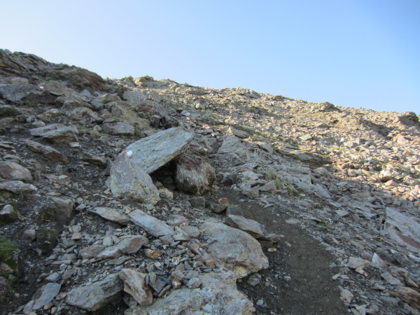 Die Wegführung ist genau nach meinem Geschmack. Blockgelände wechselt mit steilen Bergauf- und Bergab-Passagen. Nach ausgesetzten Stellen kommen auch wieder gut laufbare Singletrails in leichterem Gelände.