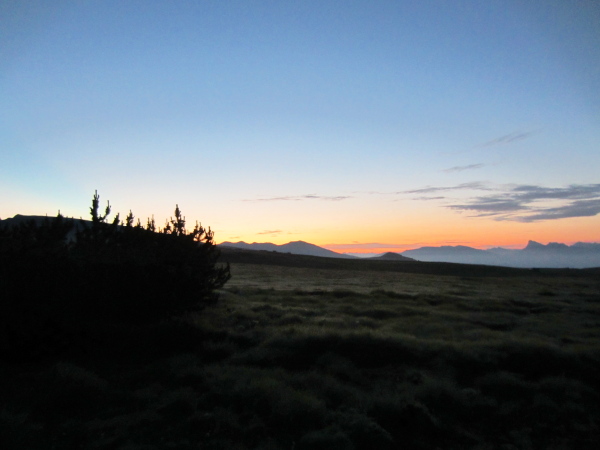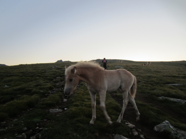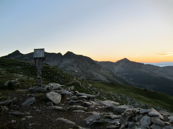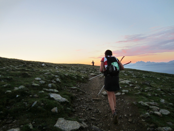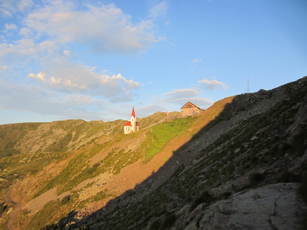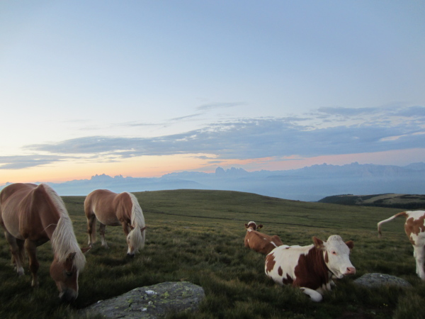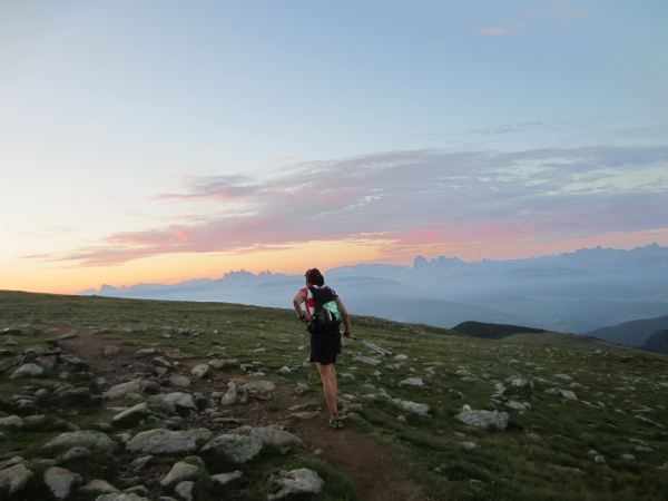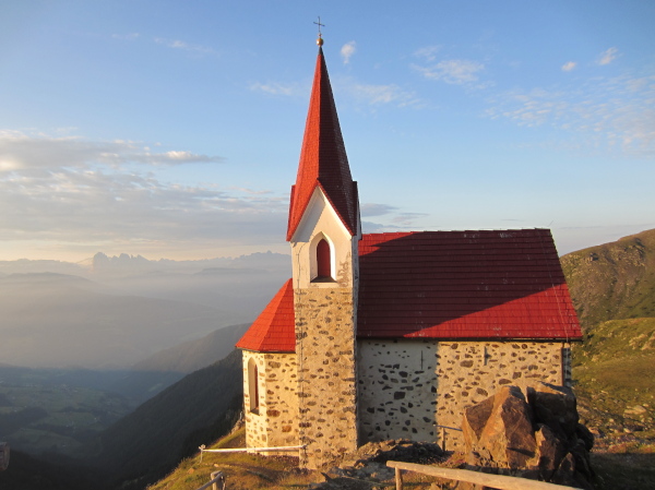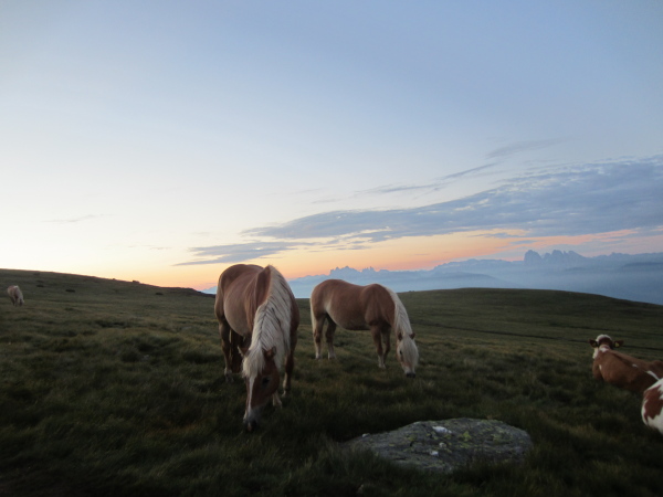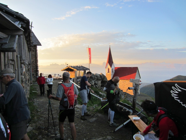Wir laufen abwärts auf eine ausgedehnte Hochalm. Langsam wird es hell. Im ersten Sonnenlicht zeigen sich Tofana, Geisslerspitzen, Sella, Rosengarten, Marmolada und Schlern. Die wiederkauenden Kühe auf den Almwiesen und die ebenfalls dort gehaltenen Haflinger ertragen den Tross der Läufer mit Gelassenheit. Am Totenkirchl der Villanderer Alp vorbei erreiche ich bald den 2. VP am Latzfonser Kreuz. Das Kirchlein am Latzfonser Kreuz ist die höchstgelegene Wallfahrtskirche Südtirols und die Pilgerstätte zählt zu den höchst gelegenen Europas. Vor dem Schutzhaus Latzfonser Kreuz gibt es Iso, Pasta, Obst und Trockenfutter. Ich stärke mich und bin nach wenigen Minuten wieder unterwegs.