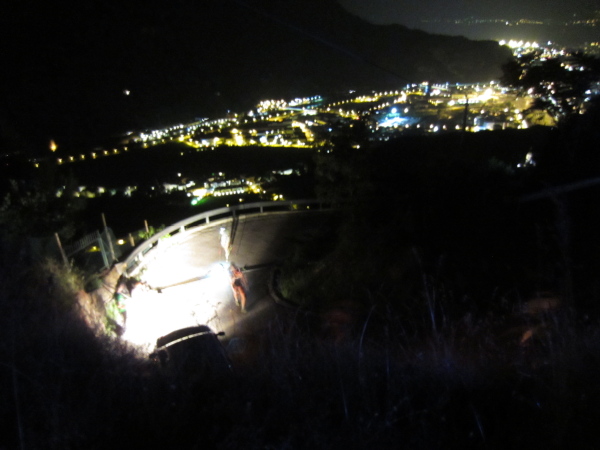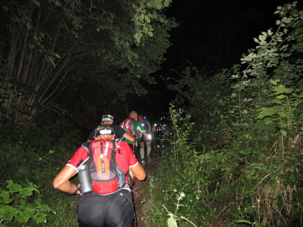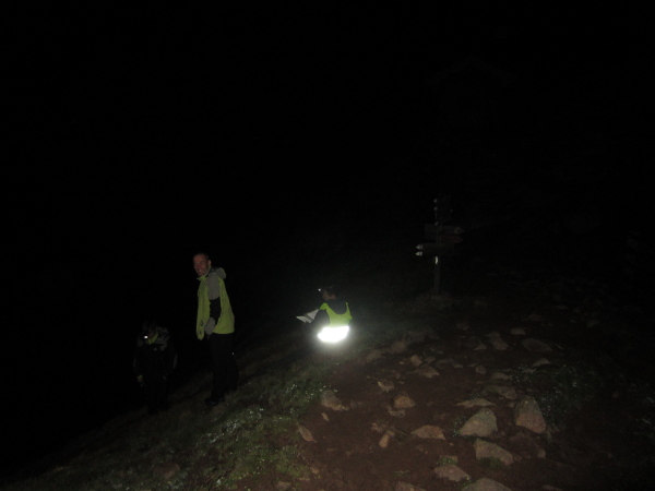 Durch Wald geht es auf wieder gut laufbaren Wegen weiter aufwärts. Die Markierungen sind spärlich. Auch wenn das Feld noch relativ eng beieinander liegt, sind die Stirnlampen der vor mir Laufenden nicht immer sichtbar. Ich beschließe, Abzweigungen am Weg einfach zu ignorieren und die Richtung beizubehalten. Das stellt sich als richtig heraus, denn Richtungsänderungen werden mit einem einzigen reflektierenden Pfeil angezeigt. Der Weg ist so durchaus zu finden, hätte man uns das beim Briefing so beschrieben, wären viele Unsicherheiten und auch der eine oder andere Verhauer zu verhindern gewesen.