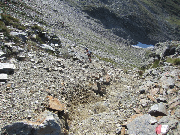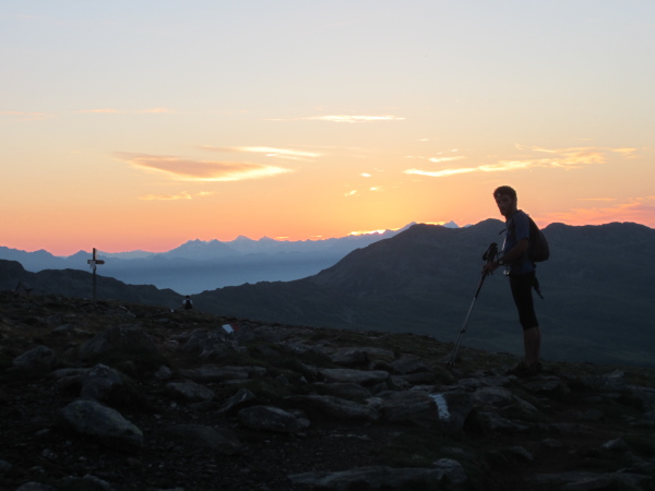Im ständigen Auf und Ab führt die Strecke über Almwege und Singletrails insgesamt weiter ansteigend zur Sarner Scharte auf 2.460 m. Der letzte Teil des Anstiegs ist technisch und leitet uns über Blockgelände steil bergauf. Helfer der Bergrettung schlagen sich dort für uns die Nacht um die Ohren.