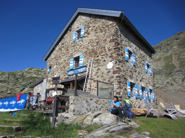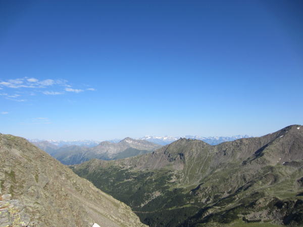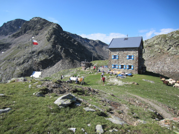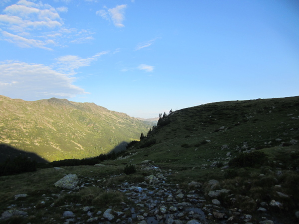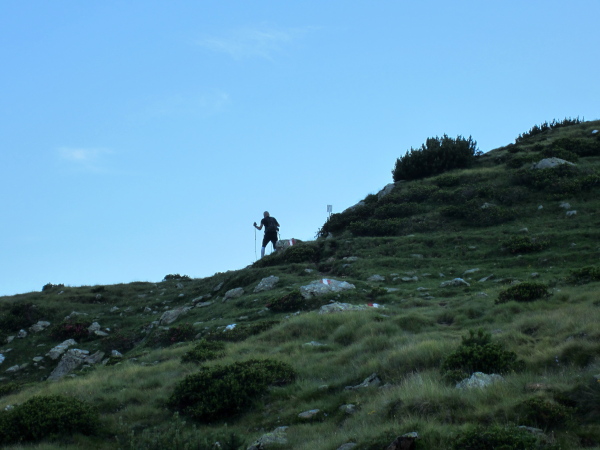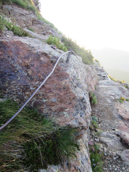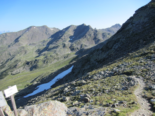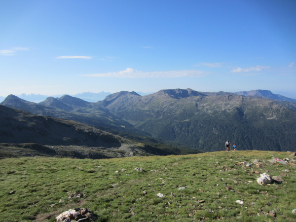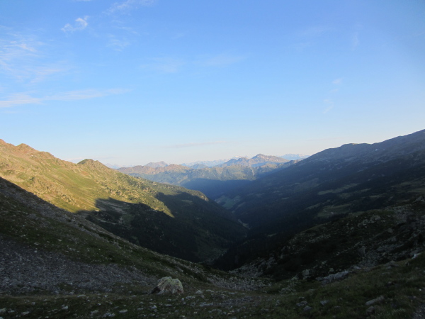 Ein sonniger und wolkenloser Tag beginnt. Glücklicherweise verläuft der Weg noch überwiegend im Schatten. Wir bewegen uns zwischen 2.300 und 2.600 Meter Seehöhe. Vom Latzfonser Kreuz aus geht es an der Kassianspitze vorbei über die Fortschellscharte und das Tellerjoch zur Flaggerscharte.