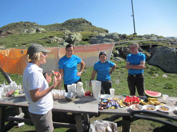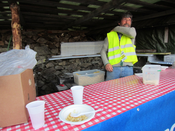 Die Informationen erscheinen klar und schlüssig. Für mich bleiben keine Fragen offen. Pasta gibt es in drei Geschmacksrichtungen, dazu Wasser und Cola. Der Himmel hat sich zugezogen, böiger Wind, leichtes Donnergrollen und ein paar Regentropfen sorgen für etwas Abkühlung.