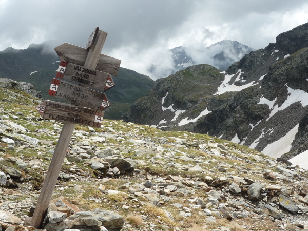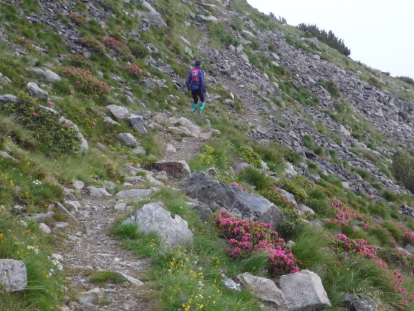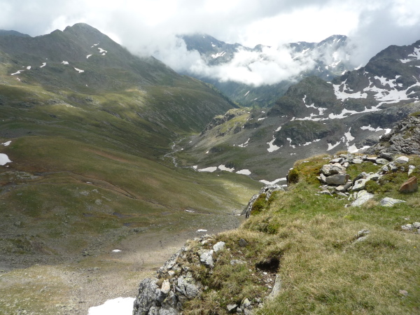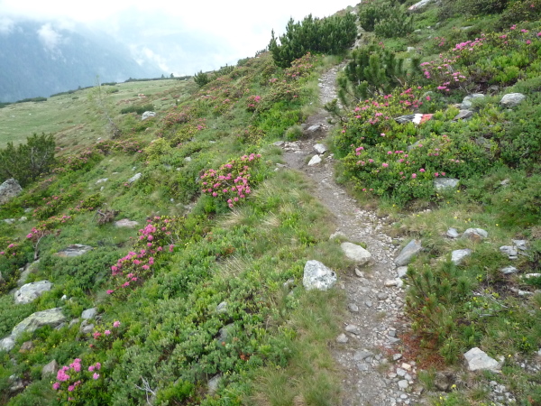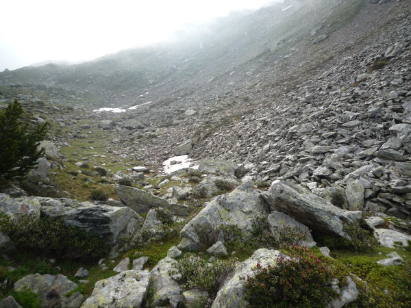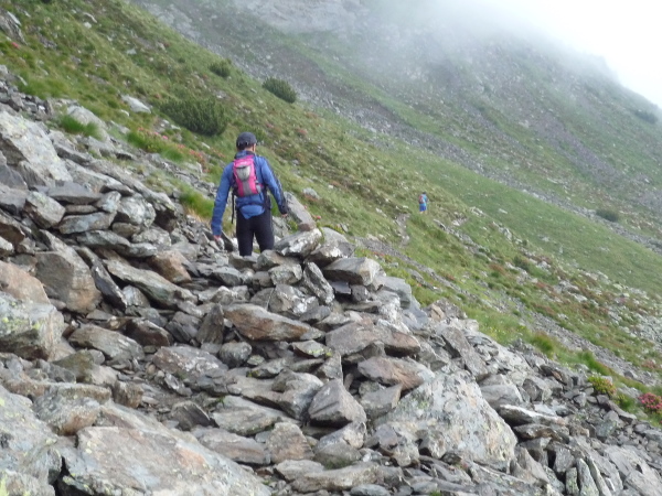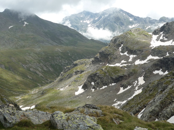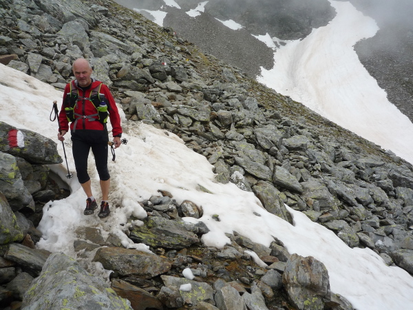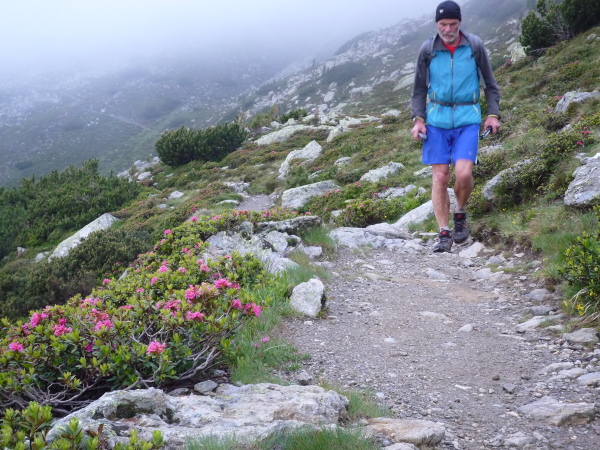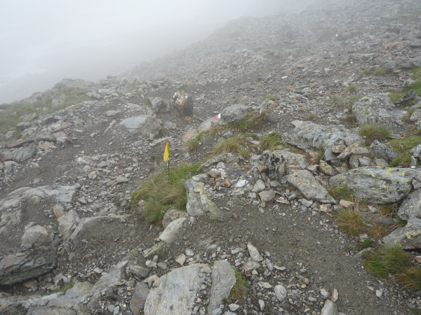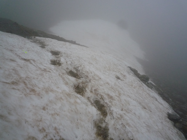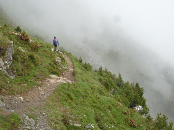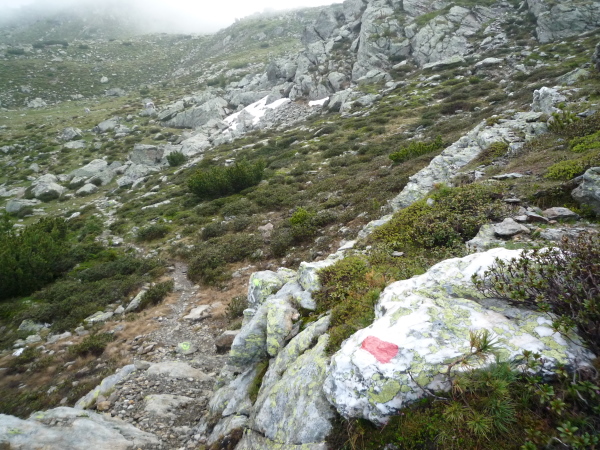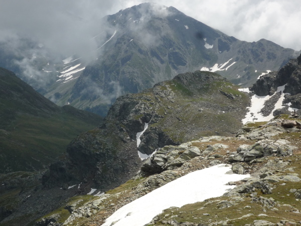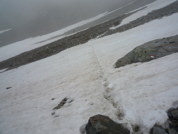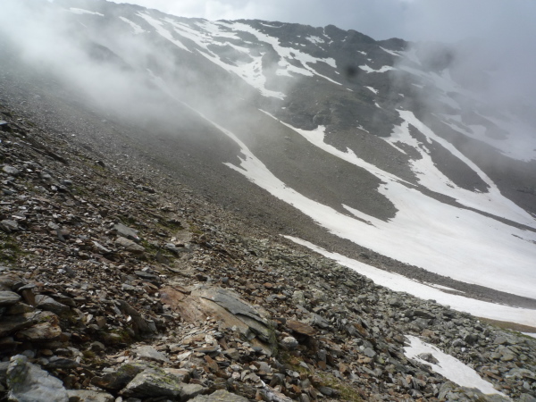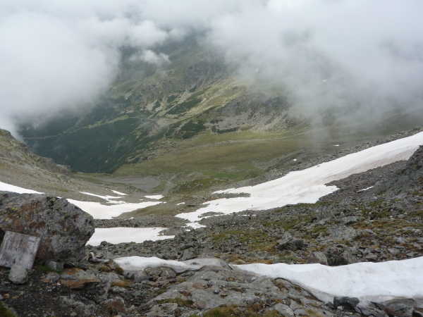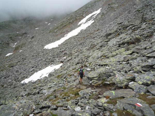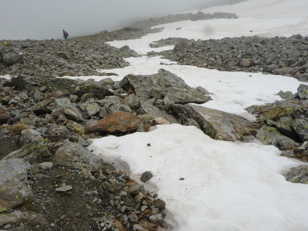 Auf einem steinigen Pfad schlängeln wir uns eine felsdurchsetzte, steile Bergflanke entlang. Immer wieder versinken wir in feuchten Wolkenschwaden, aber so schnell wie der Wolkenspuk über uns herfällt, ist er auch wieder weg. Erste kleine Schneefelder kreuzen unseren Weg.