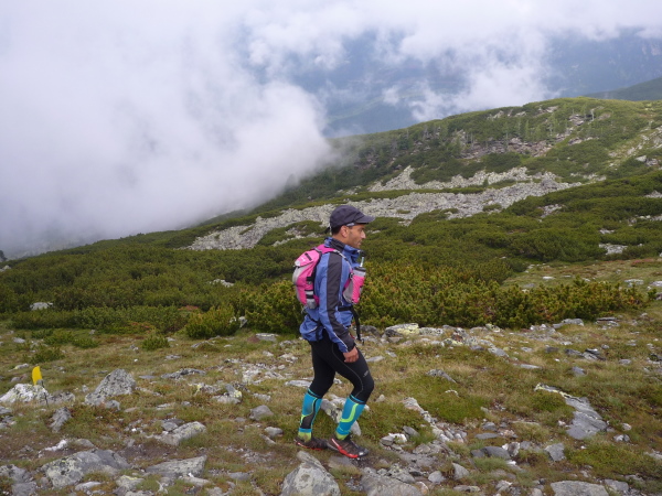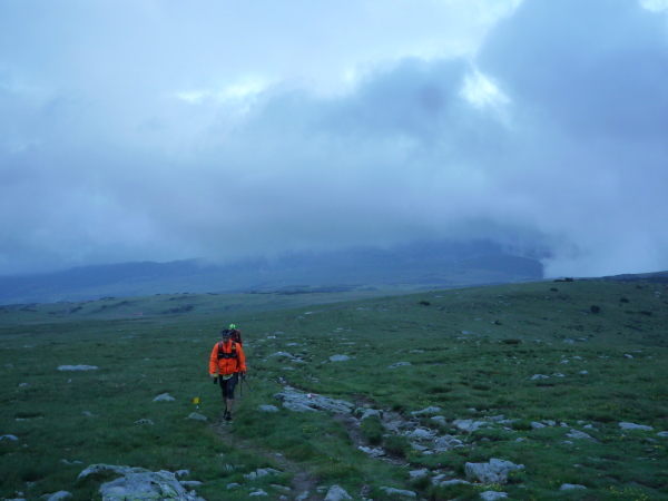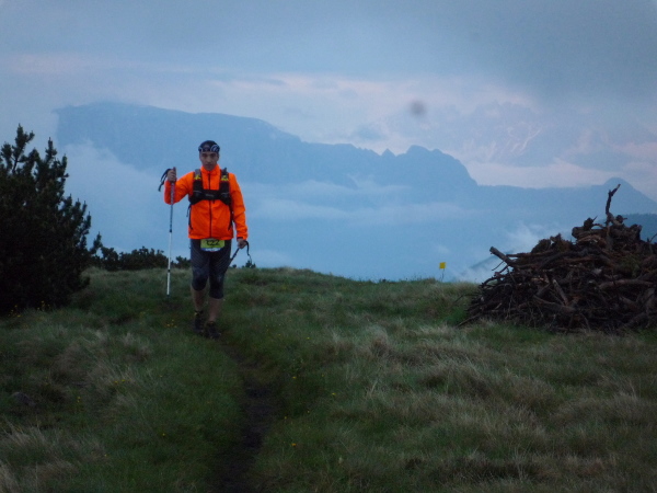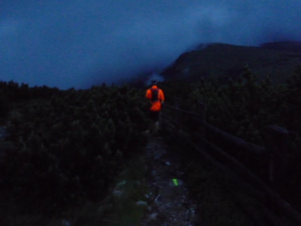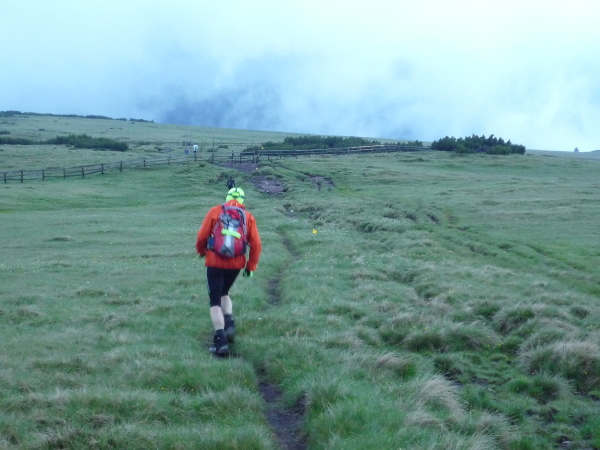 Meine Hoffnung auf einen spektakulären Sonnenaufgang muss ich schnell begraben. Dichte Wolkenbänke hängen über den Gipfeln, als sich das erste Morgenlicht breit macht. Auf vergleichsweise bequemen Wegen durchmessen wir eine weite Hochebene aus Almen und Latschenkiefernbeständen. Flott geht es voran. Kein Wunder: Es geht abwärts. Zumindest bis zu Stöfflhütte. Hier wird der Spieß umgedreht: Leicht, aber beständig aufwärts folgen wir sumpfigen Pfaden durch eine schier endlose vegetationsarme Wiesen- und Weidelandschaft. Der ferne Horizont verschwimmt in einem diffusen Gemenge aus Wolken und Bergen. Irgendwie fühle ich mich in die Einsamkeit schottischer Highlands versetzt. Einzige Farbtupfer sind die als einsame Punkte dahin wackelnden Läufer. Seitdem die 66 km-Läufer im Feld fehlen, ist das Läuferband extrem dünn geworden.