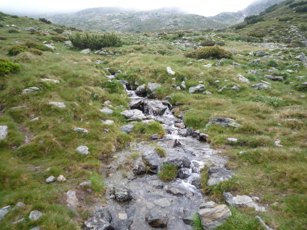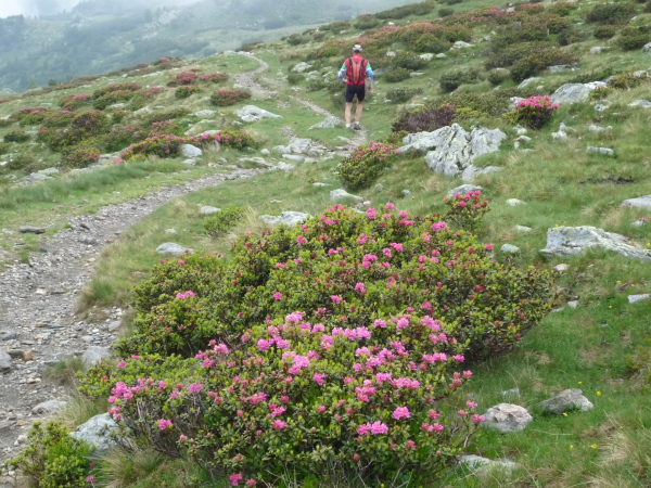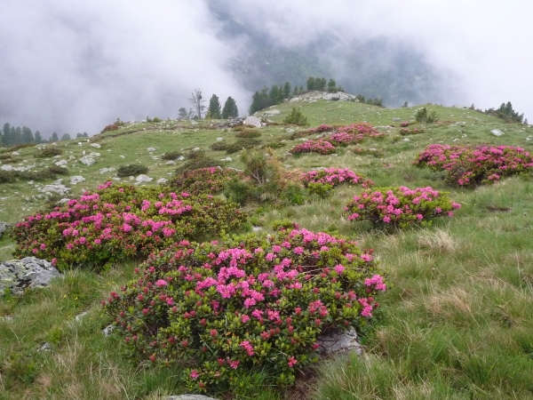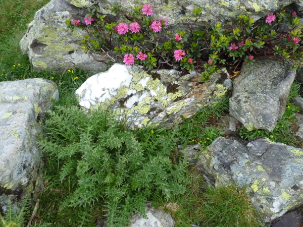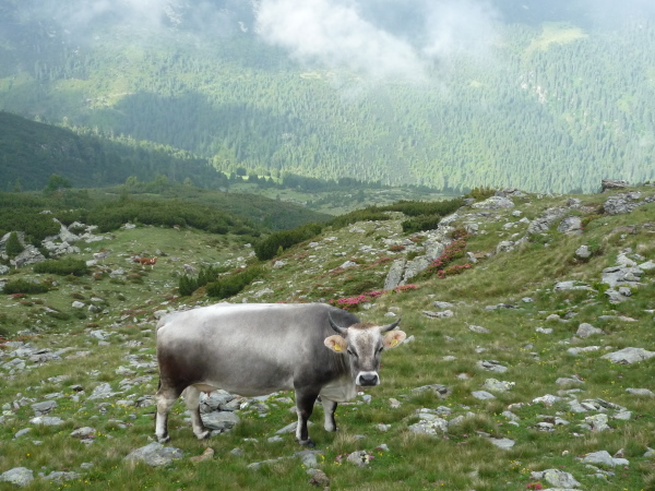 Flacher wird der Hang, aber nicht einfacher zu belaufen. Felsen, Sumpf und Wasser sind stetige Komponenten unseres Pfades. Grün und doch karg ist die stille Hochgebirgslandschaft, aber von besonderem Reiz. Niedrige Büsche mit leuchtend lila Blüten gedeihen hier, hellgrüne Flechten überziehen leuchtend weißen Quarz. Mächtige grauglänzende Kühe beobachten immer wieder aufmerksam unser Tun. Im fernen Tal bricht die Sonne durch und zaubert neue landschaftliche Kontraste. Nur zu uns findet sie nicht. Dafür klatscht uns immer mal wieder ein Regenschauer ab.