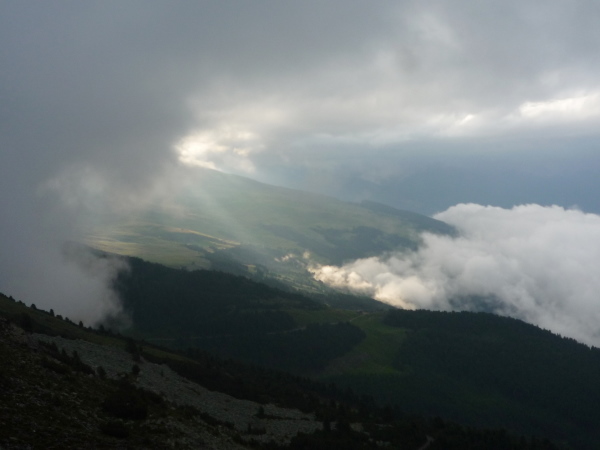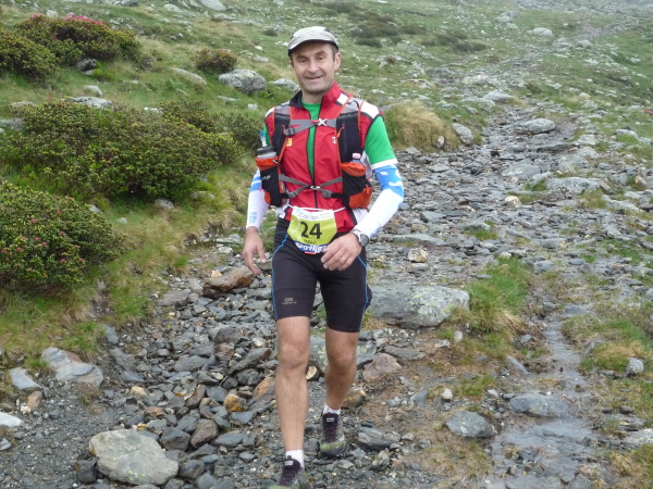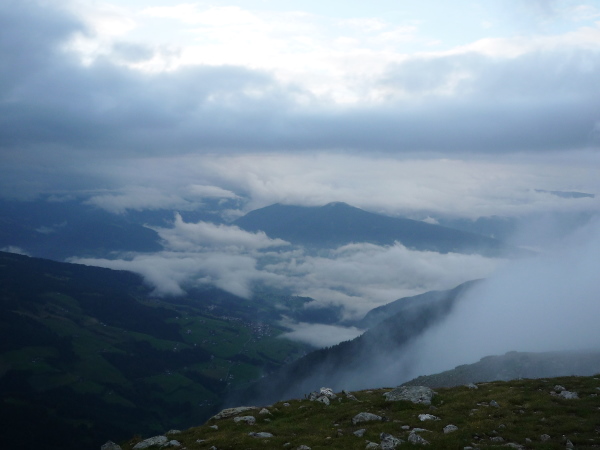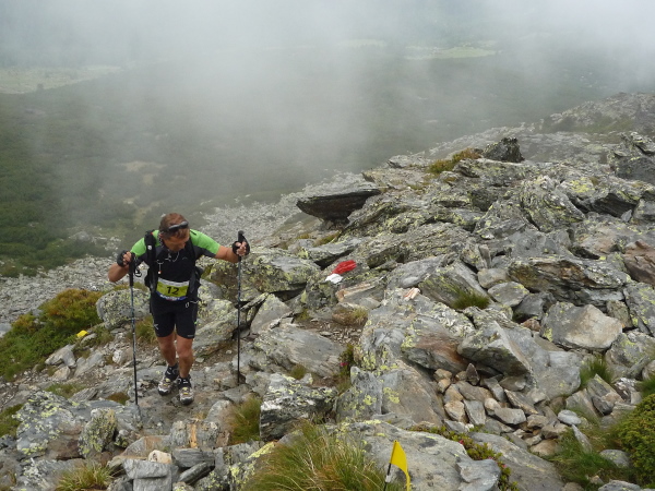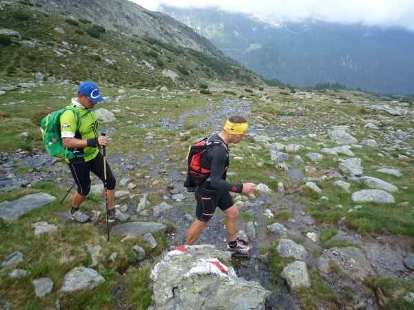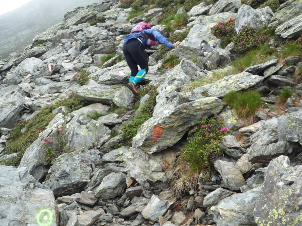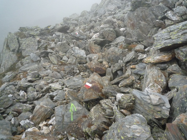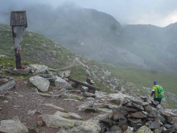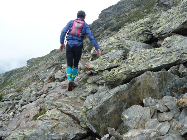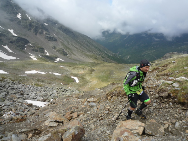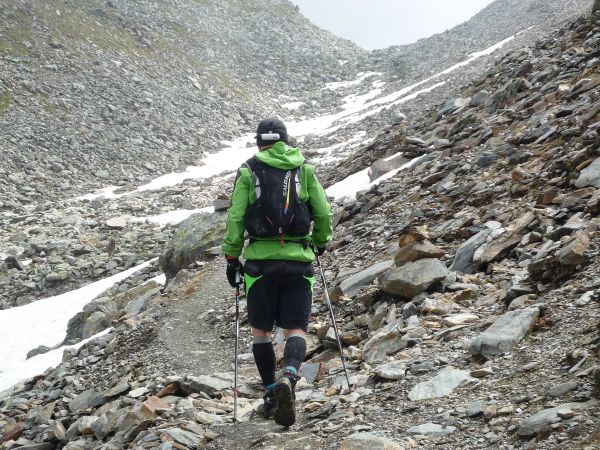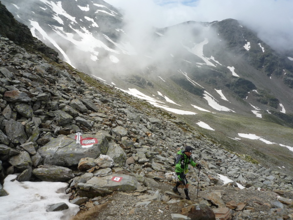 Wir gewinnen allmählich wieder mehr Höhe, das Klima wird rauer, die Landschaft noch karger. Felsen und Geröll, wohin man blickt. Ein mächtiges Geröllfeld mit wild durcheinander gewürfelten zyklopischen Steinblöcken kreuzt unseren Weg. Da müssen wir mitten durch. Stets schwenkt der Blick zwischen der Suche nach der nächsten Markierung und dem nächsten vertrauenswürdigen Tritt und Stein. Meistens hält er, manchmal wackelt es aber auch bedenklich. Spaß macht das, aber wehe, man leistet sich einen Fehltritt. Das könnte böse enden. Und noch ein wenig steiler wird es. Ich keuche wie eine alte Dampflok. Die dünne Höhenluft hat es in sich. Doch dann sehe ich sie auf einmal über mir: Die Kante des Tellerjochs. Zwei einsame Gestalten mit Zelt harren dort stoisch. Es sind erneut junge Bergwachtler, wie immer superfreudlich, superrelaxt, die mich in Empfang nehmen und die Startnummer notieren. Jenseits der Kante geht es steil hinab und zumindest kurz reißen die Wolken auf und eröffnen einen wundervollen sonnendurchfluteten Blick ins Tal hinab. Eine Minute später ist der Vorhang schon wieder geschlossen und ich stürze mich durch das Geröll in die Tiefe – nun ja, nicht wirklich, aber gefühlt.
