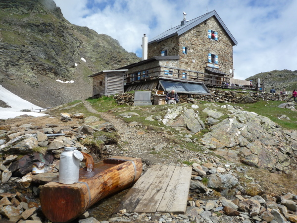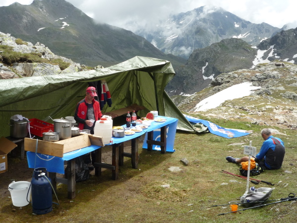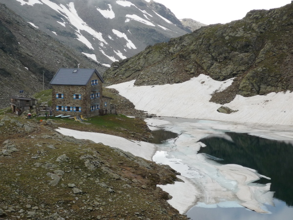 Es kommt noch besser. Durch eine Scharte hindurch gelange ich auf ein kleines grünes Hochplateau, und mittendrin thront, leicht erhöht an einem kleinen Gebirgssee, ein trutziges, altes Schutzhaus: die Flaggerschartenhütte oder, noch besser klingend, das Rifugio Forcella Vallaga (2.481 m üNN, km 50). Auf der Wiese davor stehen Speis und Trank für uns bereit. Und bequeme Liegen. Oh, ist das verführerisch! Die Sonne brennt herab. Ich werfe allen Ballast von mir und betrachte auf der Liege fläzend, Nudelsuppe löffelnd das unberührte, gewaltige Bergpanorama um mich herum. Keine Straße führt hier hinauf. Alles, was man braucht, bringt der Hubschrauber oder wird per Rucksack hoch gebracht.