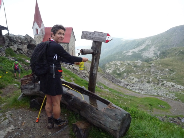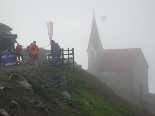 Schon von weitem sehe ich in der Bergeinsamkeit hoch oben ein kleines Kirchlein in einem Berghang thronen. Auf steiniger werdenden Pfaden nähere ich mich langsam an. Die Hochebene ist zu Ende, die Bergwelt hat uns wieder. Die im steifen Wind dahinjagenden Wolkenfetzen zaubern stetig wechselnde eindrucksvolle Landschaftsbilder, wenn sie uns nicht gerade selbst umhüllen. Wundervoll ist die Hanglage des Latzfonser Schutzhauses und des Kirchleins in 2.311 m Höhe. Die Wallfahrtskirche zählt zu den höchstgelegenen Pilgerstätten Europas. Alljährlich im Juni wird der „Schwarze Herrgott“, ein schwarzes, geschnitztes gotisches Holzkreuz, von der Dorfkirche im 1.150 m tiefer gelegenen Latzfons in einer Prozession hinauf in die Wallfahrtskirche gebracht, wo es den Sommer über verbleibt.
